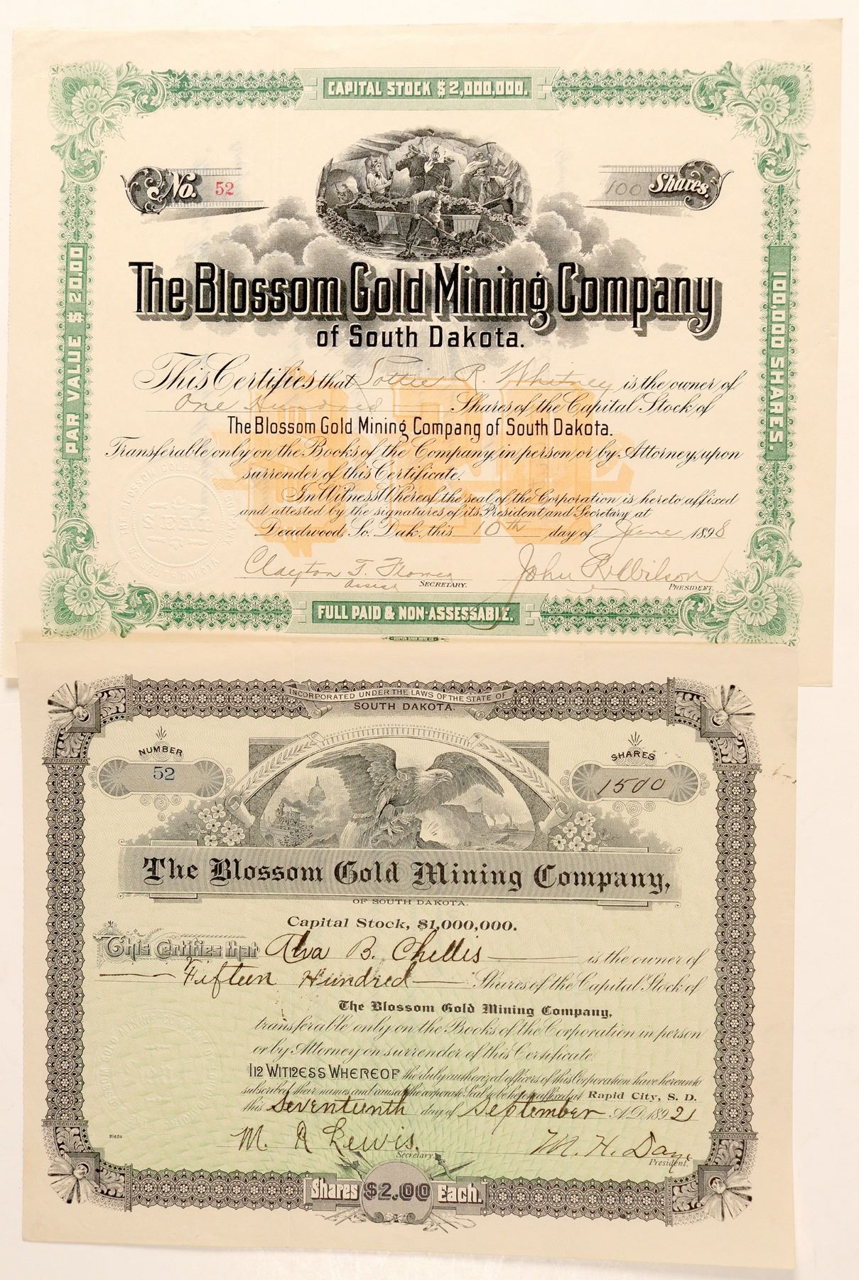Lot of two different for this Deadwood mining company. 1) No. 52, issued for 1,500 shares to Alva B. Chillis on Sept. 17th, 1892 in Rapid City, S.D. Signed by president W.H. Day and secretary M.R. Lewis. Not cancelled. Black border and print, eagle vignette. Folds, one bent corner. 2) No. 52, issued for 100 shares to Lottie R. Whitney on June 10th, 1898 in Deadwood. Signed by president John R. Wilson and the asst. secretary. Not cancelled. Green border, black print, mining vignette and RN facsimile underprint. Folds. () Ken Prag Collection