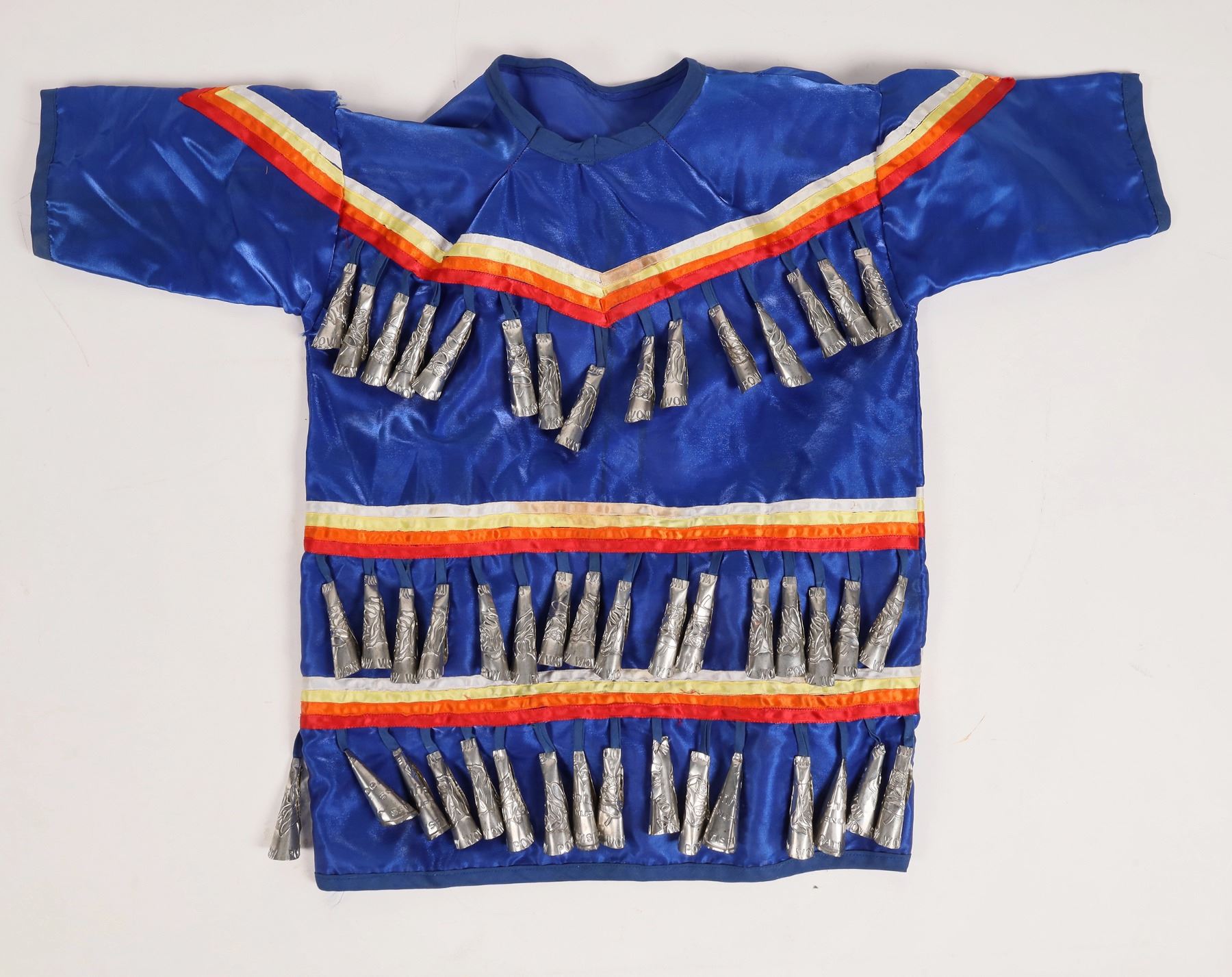 Children's blue jingle dress for dancing. White metal Pow Wow jingles on both sides. About 22x28".