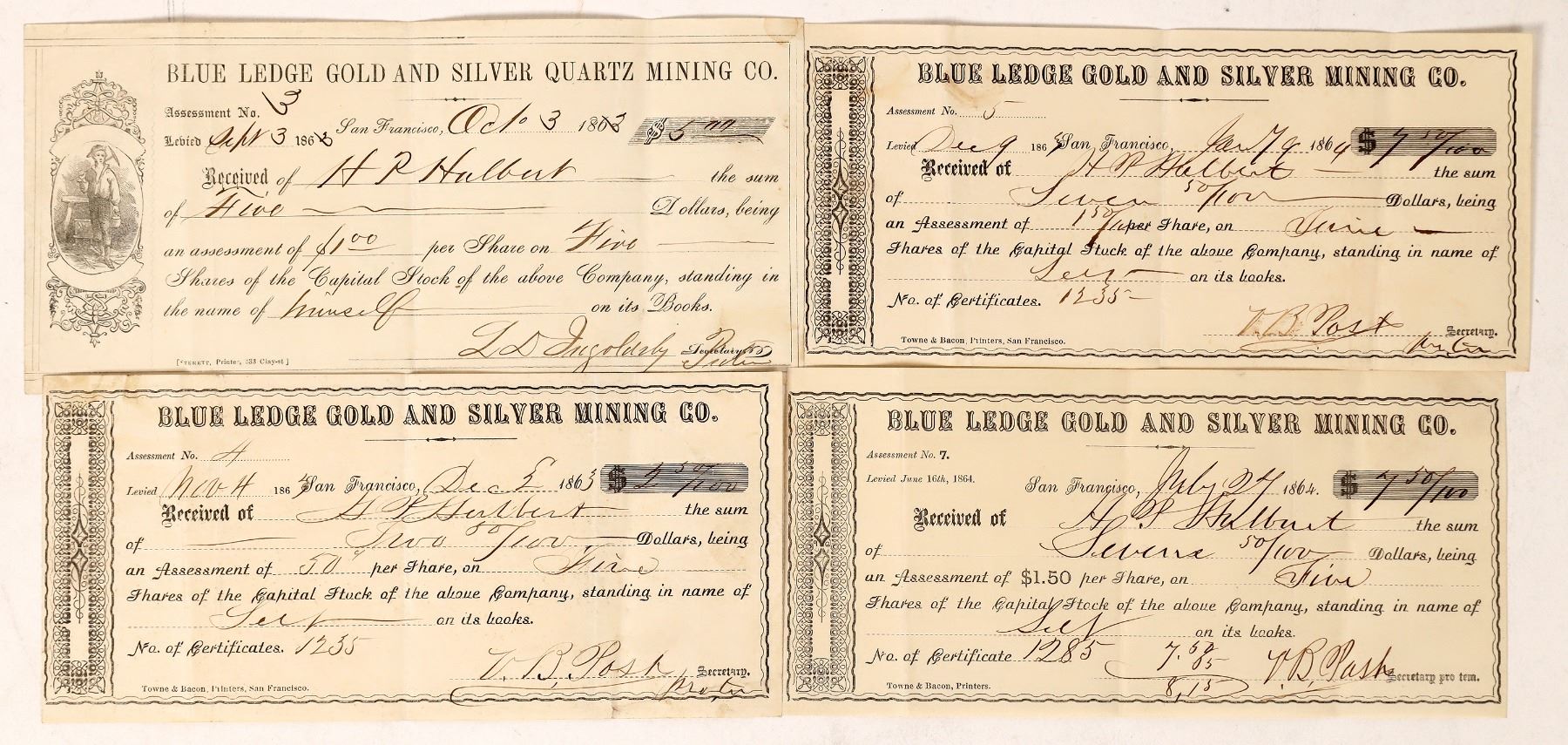 Four checks from the 1860s drawn on the account of the Blue Ledge Gold and Silver Mining Company. Printed by Towne & Bacon of San Francisco. California