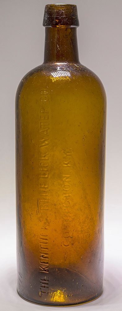 Deep amber, thousands of seed bubbles, applied top, 10.6Ó tall, 3.25Ó diameter. Tiny top of lip ÒdingÓ. Similar tiny ÒdingÓ on rim of base, both barely noticeable. This is a different Blue Lick bottle than weÕve had before. Extremely Rare, c1870Õs. Blue Lick is in Nicholas County, Kentucky on the margin of the Licking River (The Lower Spring was literally 20 feet from the river in 1873). There were two separate springs, the Upper and Lower Blue Lick Springs, managed separately, according to Walton, 1873 The Mineral Springs of the United States and Canada. The upper springs were Òexceptionally fine waters of the saline-sulphur classÓ. It was bottled and distributed Óin the leading cities of the Ohio and Mississippi Valley.Ó The Lower Springs were well known to Pioneers, and this spring was used by Daniel Boone who also got salt from the site to cure venison.