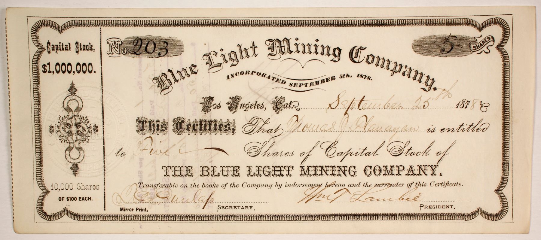 # 203 for 5 shares to Thomas J Hanagan. Signed by JD Dunlap (discoverer of the mine) and WIlliam T Lambie(?) as president. Dateline Los Angeles September 25, 1878. Incorporated Sept. 5, 1878. Not cancelled. No vignette. No location, but see below to provide authenticity. Mirror Print. One slightly rounded corner is all that mars this wonderful specimen. Elsie McClelland ["Silverado Canyon Sketches--1853-1953,"] credited U.S. Marshal J. D. Dunlap with stumbling upon an old Mexican silver mine here in 1874 while chasing a murderer in the Santa Ana Mountains. McClelland said Dunlap filed a claim to that old Mexican mine. It was at first called the Dunlap Mine, then renamed the Blue Light Mine. Whatever its origin, the Blue Light Mine endured. It became the largest silver producer of the boom town of Silverado. Mining at the Blue Light continued, off and on, until the late 1950s, with zinc being the principal mineral taken out during the 1940s. Prag Collection