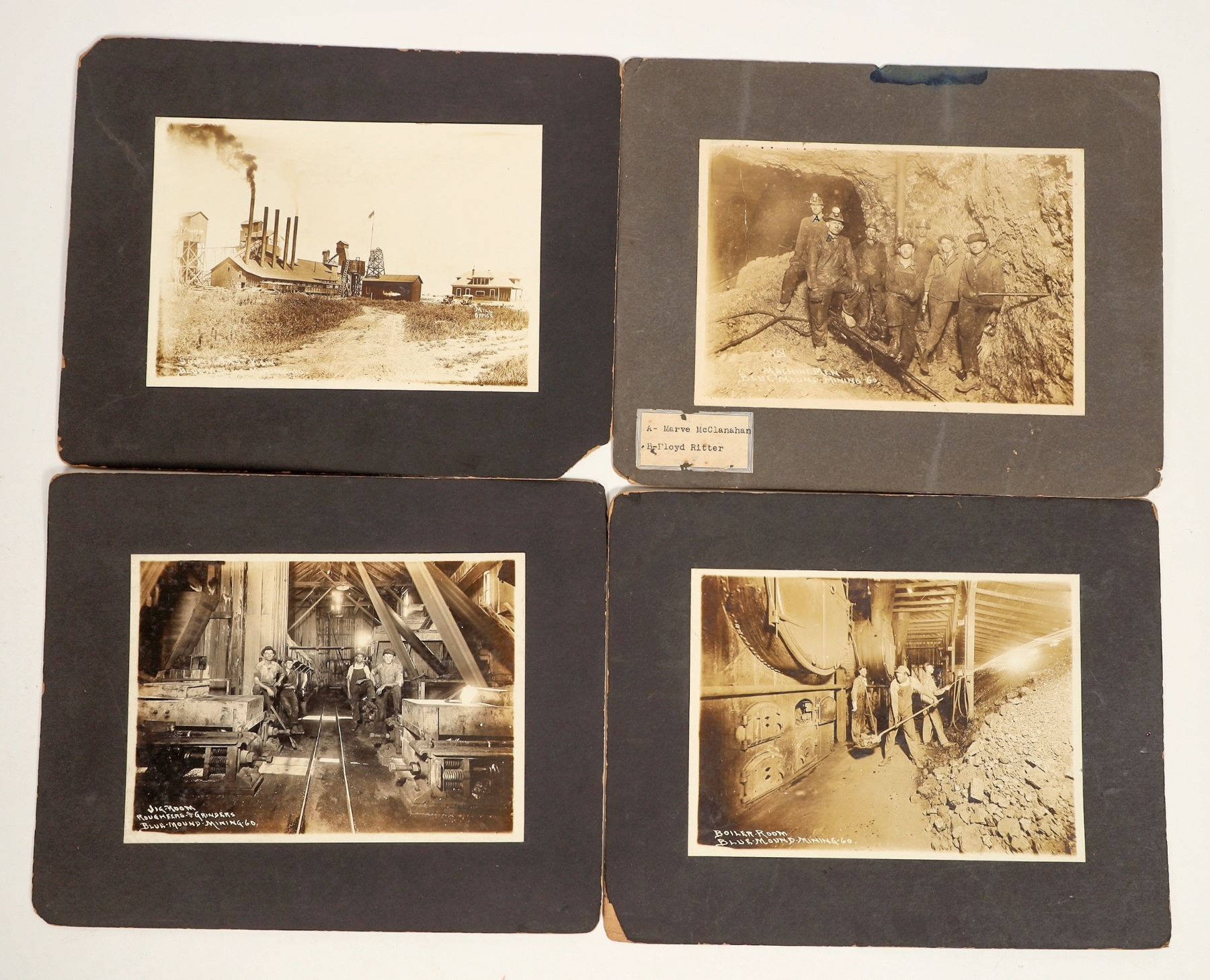 Lot of 4 different labelled photographs for the Blue Mound Mining Company, which operated at Baxter Springs, Kansas adjacent to the Blue Diamond MC. Views include Jig Room, Boiler Room (loading coal into the boilers), underground view of 7 miners next to drill (two identified), and surface view of the mine and mill office. All are roughly 5 x 7" on 8 x 10" mounts. No photographer identified.