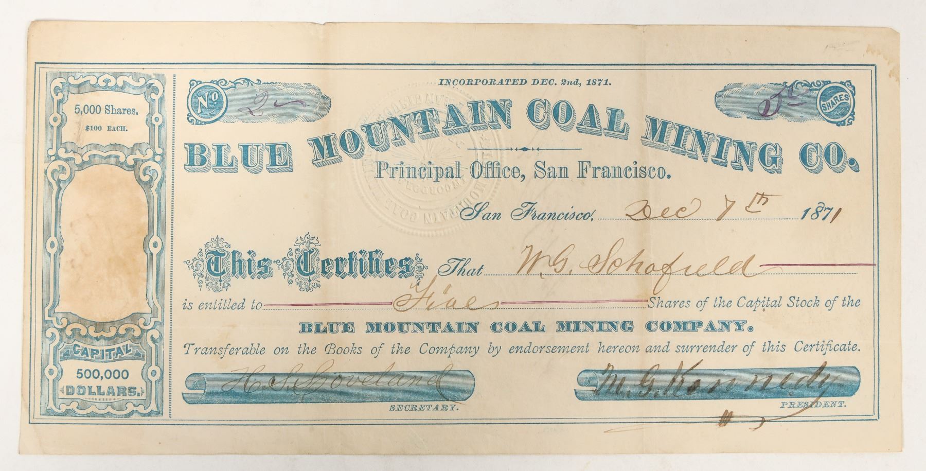 Inc. Dec. 2nd, 1871. Low certificate number 2, issued in 1871 to WG Schofield for 5 shares. Signed by president Kennedy and secretary Loveland. Not cancelled. Blue print. Deep folds with some discoloration. According to the Daily Alta, the company was formed "to mine for and trade in coal, and to deal generally in coal mines and coal mining interests in the State of Oregon." Our consignor argues it operated the Heckendorn (Blue Mountain) mine four miles east-northeast of Fuchs, Blue Mountain Mining District, Calaveras County, but we can find no proof of this. Small lignite (low-grade coal) deposits were discovered in Calaveras County, California, during the 19th century, particularly near Valley Springs and the Campo Seco area. These occurrences were limited and never developed into large commercial coal mines, but they were noted in early geological surveys and used locally for fuel.