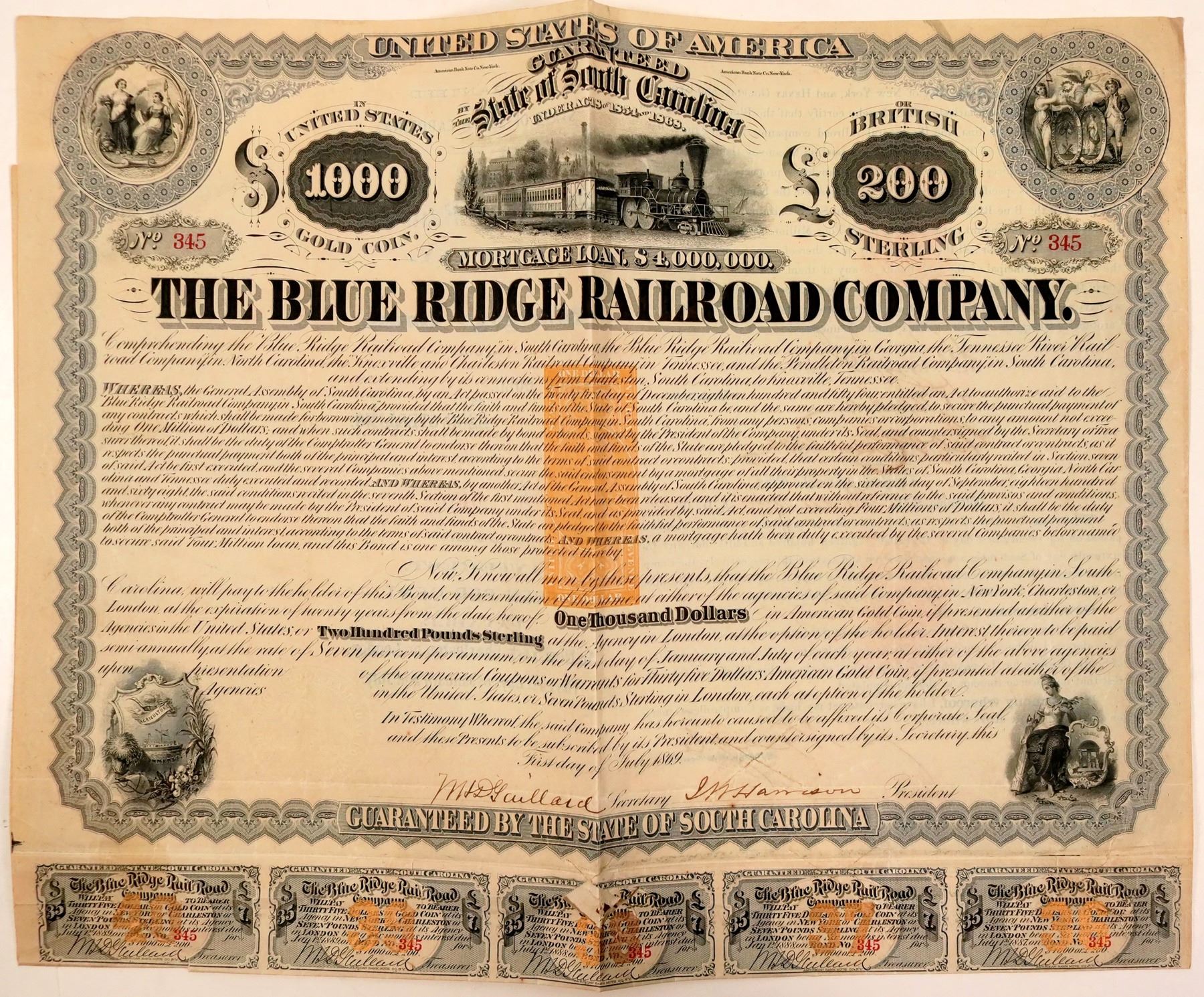 Cert. #345, issued in 1869. Guaranteed by the State of South Carolina. Train pulling four cars is center vignette. Four other vignettes in the corners. RN-W2 imprinted revenue stamp at center. Two RN-P5's on the back. Payable in $1,000 U.S. Gold Coin or 200 British Sterling. Cut cxls at bottom of bond and through coupons. Two cut cxls at the bottom of the bond have been taped archivally on the verso.