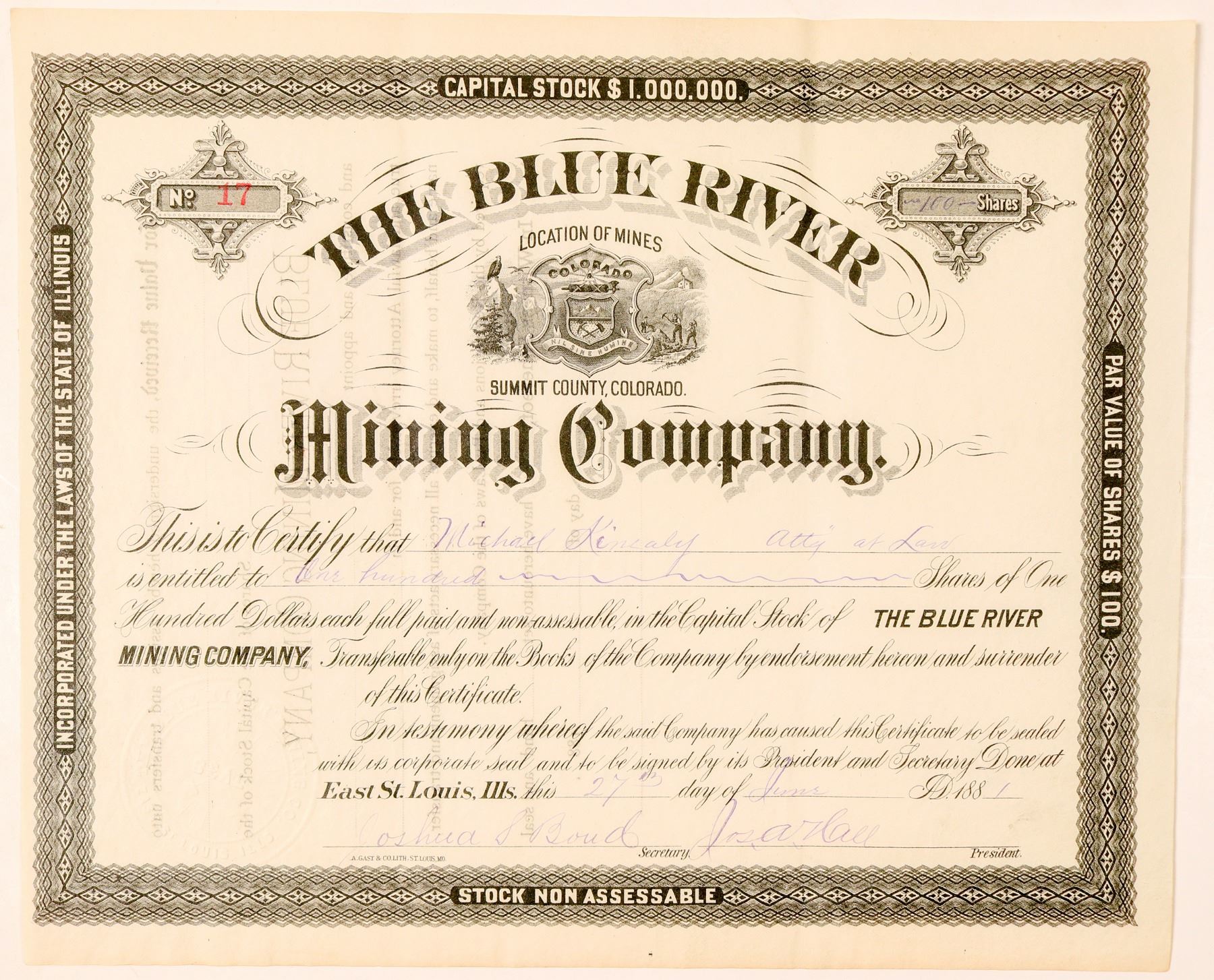 Location of Mines Summit County, Colorado (printed under title). Inc. in Illinois. No. 17, issued for 100 shares to Michael Kinealy on June 27th, 1881. Signed by president Jos. Hall and secretary Joshua Bond. Not cancelled. Allegorical vignette of Colorado shield. Printed by A. Gast & Co., St. Louis. Folds, clean. 8.5 x 10.25" Listed in 1879 CO Mining Directory but with no details. The 1883 directory states the company owns the Blue River placer (91 acres) situated at the mouth of French Gulch at Breckenridge. The company also owns interests in the Union French and Gold Run ditches (fluming and sluicing). A 155 ft. shaft has also been developed on the Blue River No. 1. (pg. 752). () State: Colorado City: Summit County Date: 1881