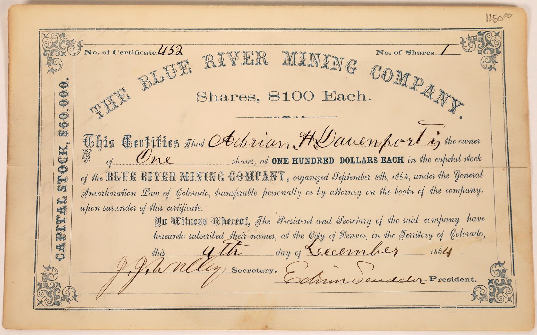 Very rare! This is a very early Colorado mining stock. Certificate #452, issued for one share to Adrian H. Davenport on Dec. 4th, 1864. Signed by Secretary, J. J. Wulley and President, Edwin Scudder. 5 x 8" Incorporated in Denver Sept. 18, 1864 and capitalized at $60,000; 600 shares at $100 per. On reverse transfer dated Sept. 12, 1866. Printed blue on white stock. Placer gold was discovered in the Breckenridge, or Blue River District, in 1859. Blue River District Colorado