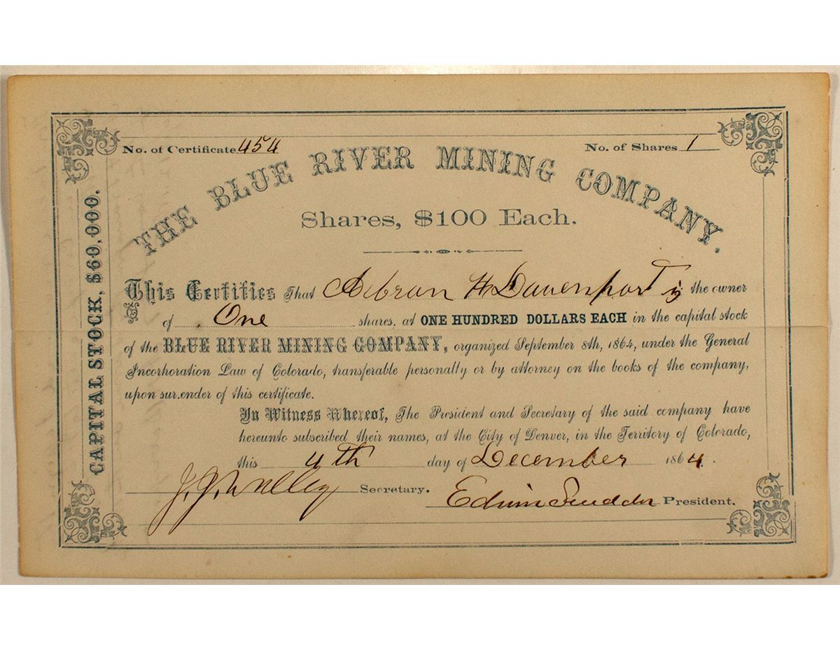 Territorial. Very rare. Inc. in Colorado on Sept. 8th, 1864. No. 454. Uncancelled. Issued for one share ($100) to Abram H. Davenport on Dec. 4th, 1864. Signed by Edwin Scudder (president) and J.G. Wiley (secretary). Reverse has notation from Davenport authorizing _____ to act on his behalf, dated Sept. 12, 1866. Blue text on white paper. The mine was located in Summit County. The name appears in the 1883 Congressional Edition, Volume 2113, listing R.A. Sanky as president. Measures 8"x 5" Fold line and tear forming at fold (center right), plus some light toning around edges. Very nice example of a scarce certificate.City: BreckenridgeCounty: SummitState: CODate: