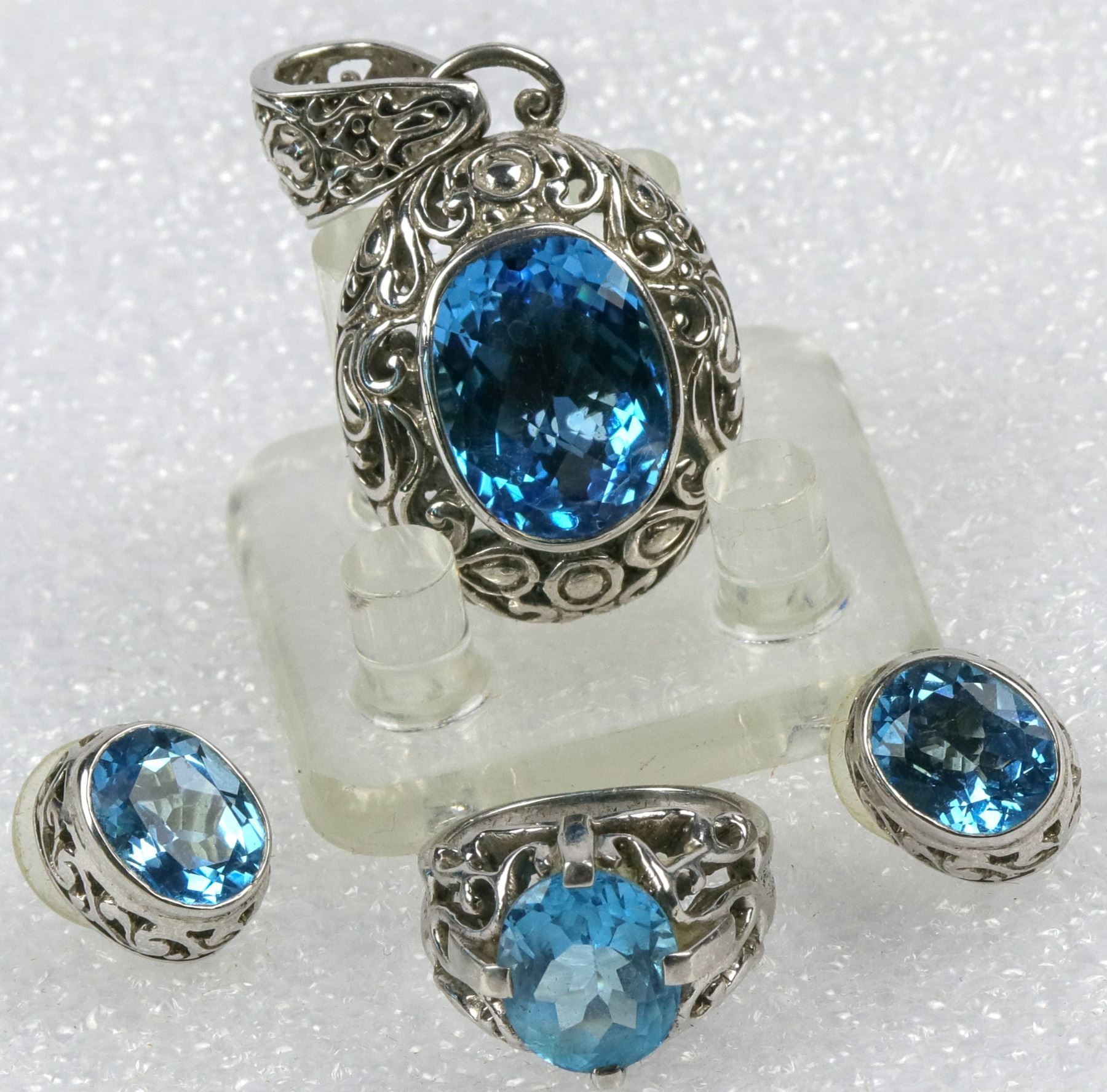 Pendant (1.25" oval ), earrings (pierced, .5" oval), and ring (.5" oval, size 6). Silver, set with blue topaz. Elegant high silver filigree settings. Please see photos.