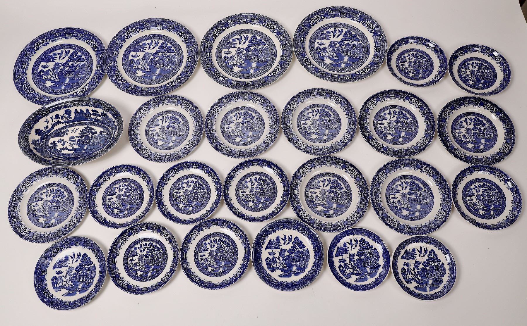 Lot of about 21 pieces of Blue Willow china including about 20 plates of various sizes and one small serving bowl. Most of these pieces have the Wood & Sons, England maker's mark printed on them. Good condition overall, some may have small chips or scratches.