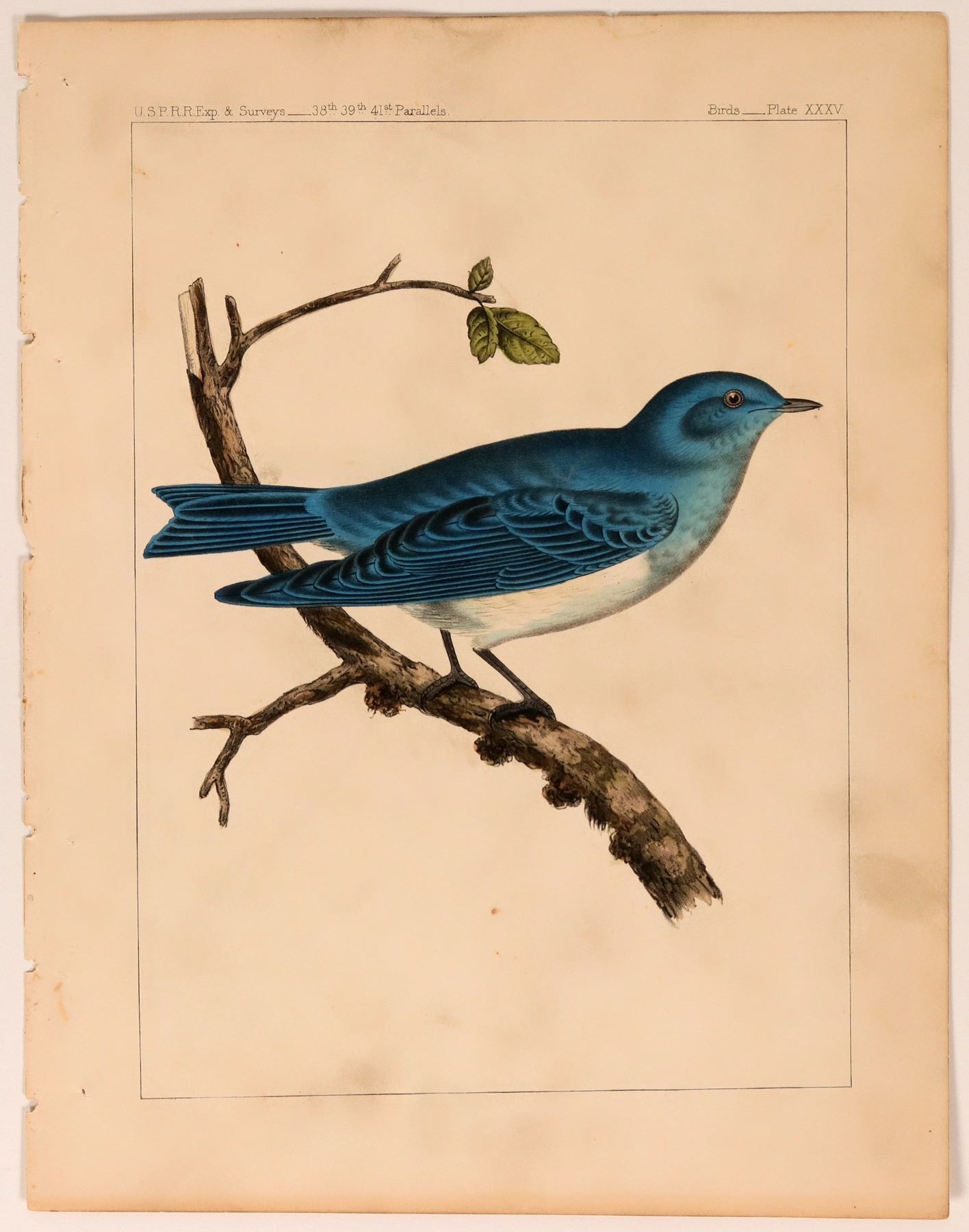 Nice color lithograph of a bluebird. From USPRR Exp & Surveys, 38th, 39th 41st Parallels. Plate XXXV. c.1850s. 11.5 x 8.75" Soiling.