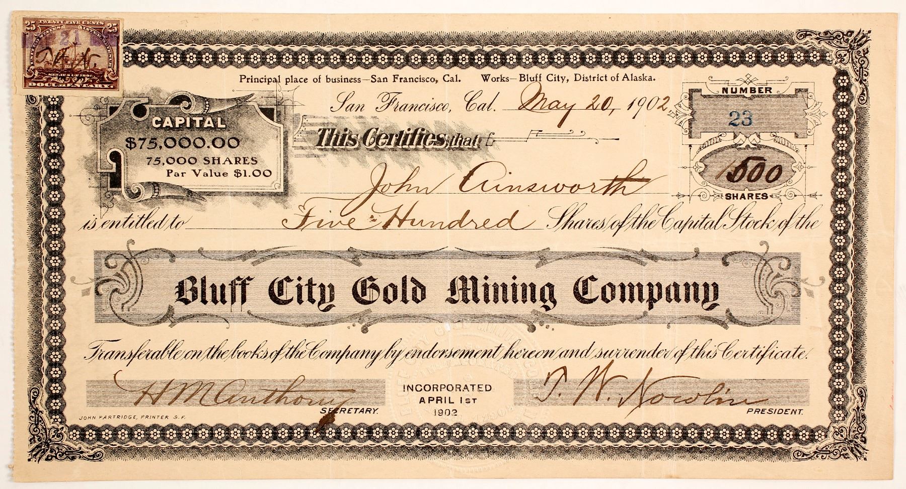 # 23 for 500 shares to John Ainsworth. Signed by HM Anthony and TW Nowlin. Dateline San Francisco 1902. Incorporated April 1, 1902. John Partridge of San Francisco printer. Not cancelled. 25c document stamp. Assessment hand written note on reverse. Hole at stamp. No other edge, corner or discoloration issues. Location of works: BLuff City, District of Alaska. Bluff City was a 20th-century mining town in Alaska. It was built on the Seward Peninsula in 1900 as a result of the Nome Gold Rush. The town was located 55 miles southeast of Nome. Prag Collection State: Alaska City: Bluff City Date: 1902