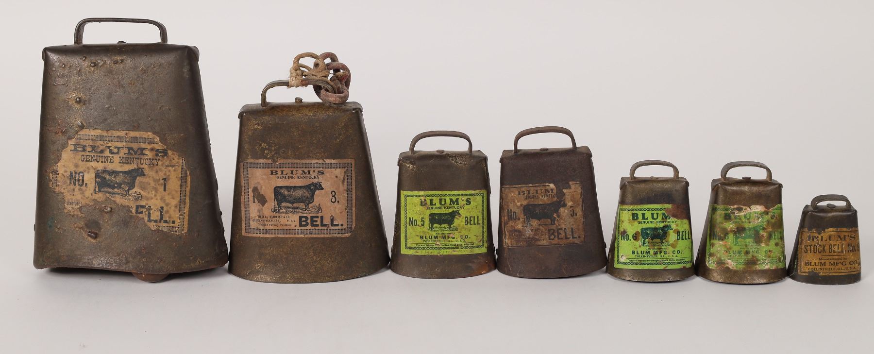 An assortment of seven (7) Blum Genuine Kentucky Cowbells.