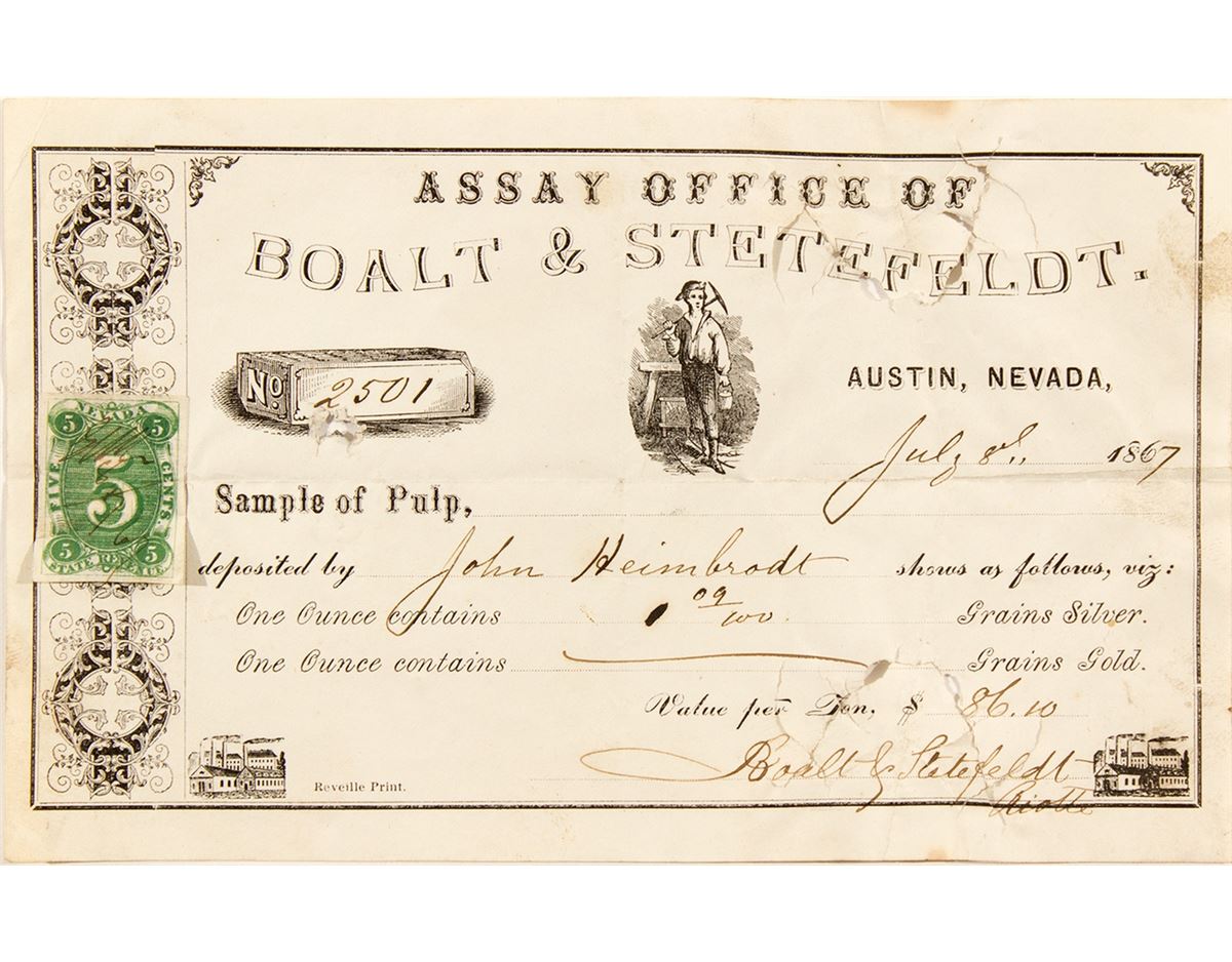 Early assay receipt (#2501) from Boalt & Stetefeldt for John Heimbradt. Silver valued at $86.00 per ton. (No gold!) Green Nevada revenue stamp attached. Small vignette of miner.
