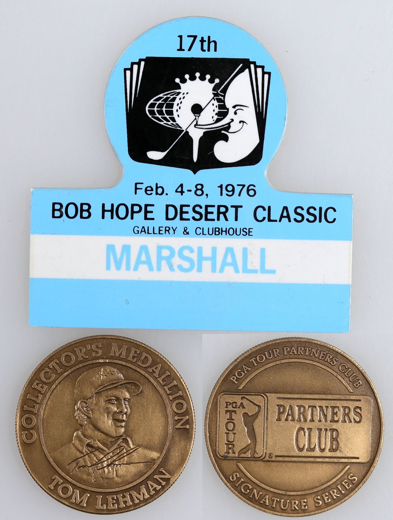 Lot of 2. 1. 1976 Bob Hope Desert Classic Gallery and Club House ID badge printed "Marshall" unk. if the name of a person or Marshall of the tour. 2. Tom Lehman PGA Tour Partners Club collectors challenge coin. California Palm Springs 1976 Ken Prag Collection