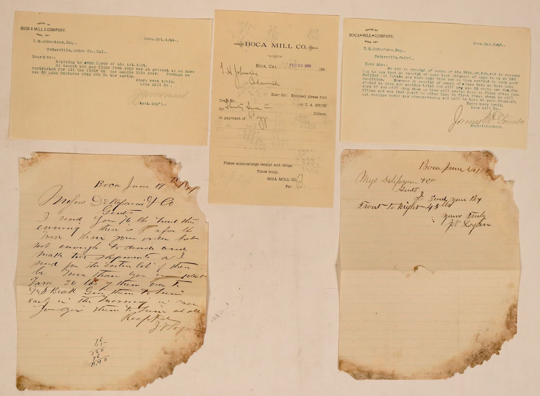 Lot of 5. 1) Three printed letterheads, 1894-95, two different types. All sent to TH Johnstone of Cedarville, California. Regarding shipments of eggs and flour. 2) Two manuscript documents, dateline Boca, from JV Logan to Messieurs Dellepiane & Company. Damaged. Dellepiane was a San Francisco grocer who would need the Boca ice to ship fresh produce throughout California. According to the Truckee-Tahoe Historical Society, Boca became a community in 1868 when the Boca Mill & Ice Company opened shop. Boca ice and wood also supplied the mines of the Comstock.