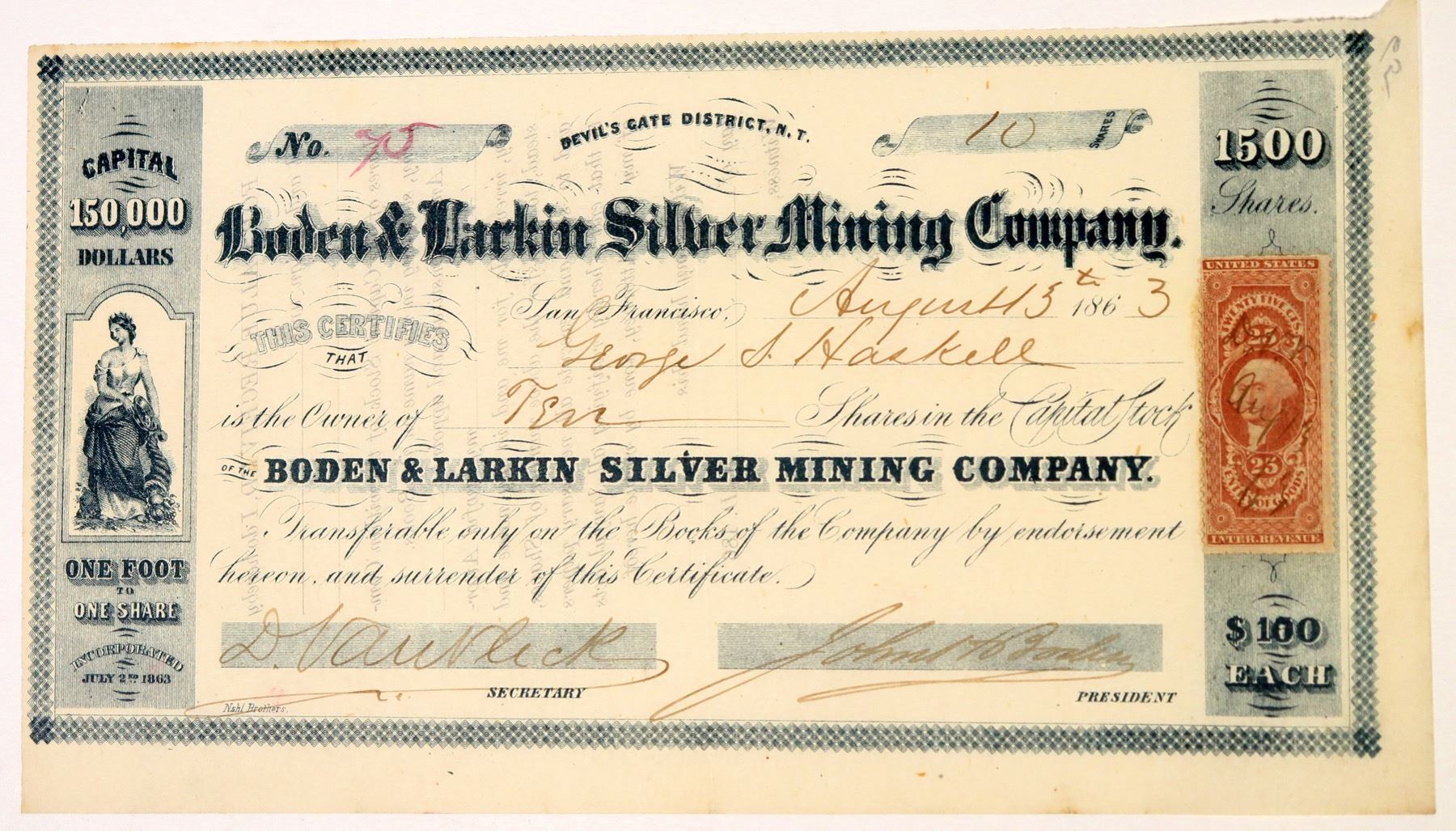 # 75 for 10 shares to George S Haskell. Signed by D Van Vleck and John Boden as president. Nahl Brothers printer. Nahl Brothers were considered two of San Francisco's greatest early artists. Van Vleck is listed as a wood engraver and San Francisco painter. The Hugo and Charles Nahl and secretary Durbin Van Vleck worked together on several projects. Dateline San Francisco August 5, 1863, and incorporated July 2, 1863. Not cancelled. 25c Entry of Goods Revenue stamp. Location: Devil's Gate District, N. T. One foot to one share. Allegorical female vignette. Boden is listed as clerk with Henschel & Maurice in the 1863 Langley directory. The mining company is not listed. The Devil's Gate District was organized November 18, 1859. Located on the southeast slope of the Virginia Range. The Devil's Gate is a natural formation at the entrance to Silver City. Background to Boden, Nahl and Van Vleck included! Very interesting piece. City:Devil's Gate, Lyon Co. State:Nevada Date:1863