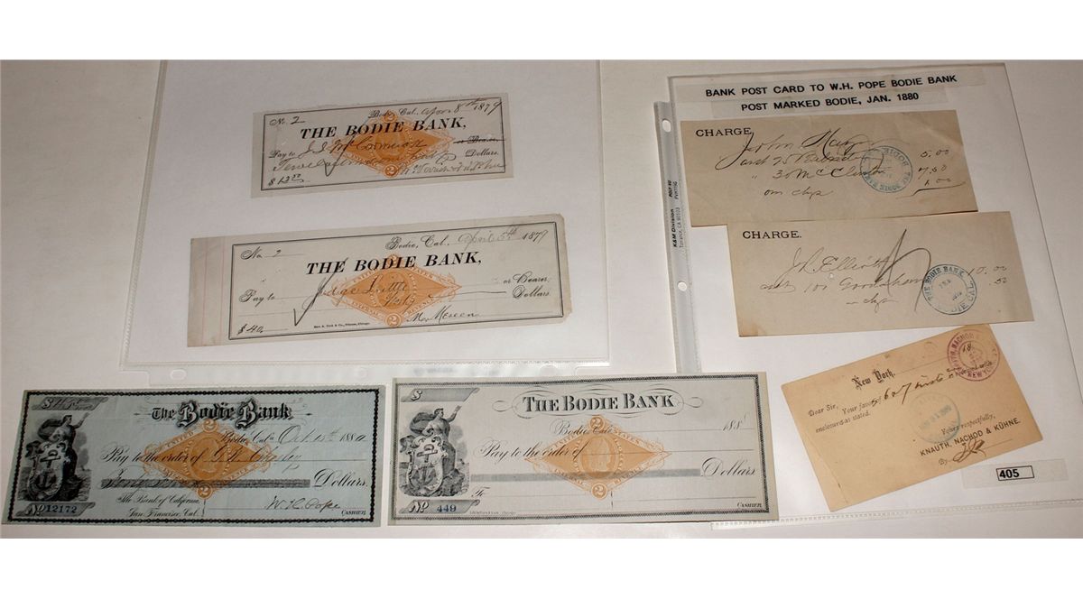 Nice set of 4 checks plus other bank documents from the great mining town of Bodie, CA. 1) Unused check No. 449. Tan colored. RN-G1. Vignette at left. 2) Green/blue check No. 12172. RN-G1. Dateline Bodie, Cal. Oct. 15th, 1880. Pay G.W. Chesley $45. Signed by Pope as cashier. Spindle hole. Reverse is signed by Chesley and stamped "For Deposit with bank of California, Frank Miller, Cashier." 3) Different style Bodie Bank check. Smaller (6 1/2" x 2 1/2"). RN-G1. Dateline Bodie, Cal. April 8, 1879. Pay to J.S. McCormack $12.50. Signed by illegible. Three spindle holes. 4) Larger version of 3. Dateline Bodie, Cal. April 5, 1879. Pay to Judge Little $40. Signed by M. Meseen (?). RN-G1. Spindle holes and folds. Bottom right corner missing. 5) Two charge slips (one from 1878 and one from 1879) that each measure 7" x 3". Both have blue Bodie Bank stamp. Folds and pinholes. 6) Postcard from bank in New York addressed to WH Pope, cashier in Bodie. Stamped "Received Jan 31, 1880/ Bodie, Cal." Measures approx. 5" x 3" Date: Bodie CA hwac 20808