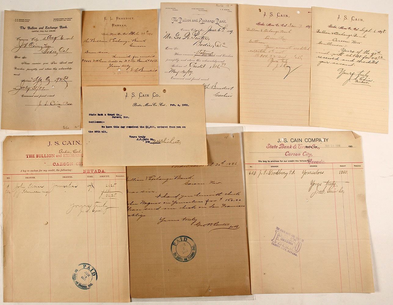 Ten items. 1) 1886 letter from George Penter to the Bullion & Exchange Bank per John Wagner. 2) B&E letterhead to George Penter in 1889. Signed by his cashier Benedict. 3) EL Benedict, banker, letterhead in 1891. 4) B&E letterhead to JS Cain in 1901. 5-7) Statements to JS Cain from the B&E and later the State Bank & Trust. 8-10) JS Cain letterheads (two different) to the banks in Carson City. (Potter Collection) Date: 1886-1904 Location: Bodie, California HWAC# 58337