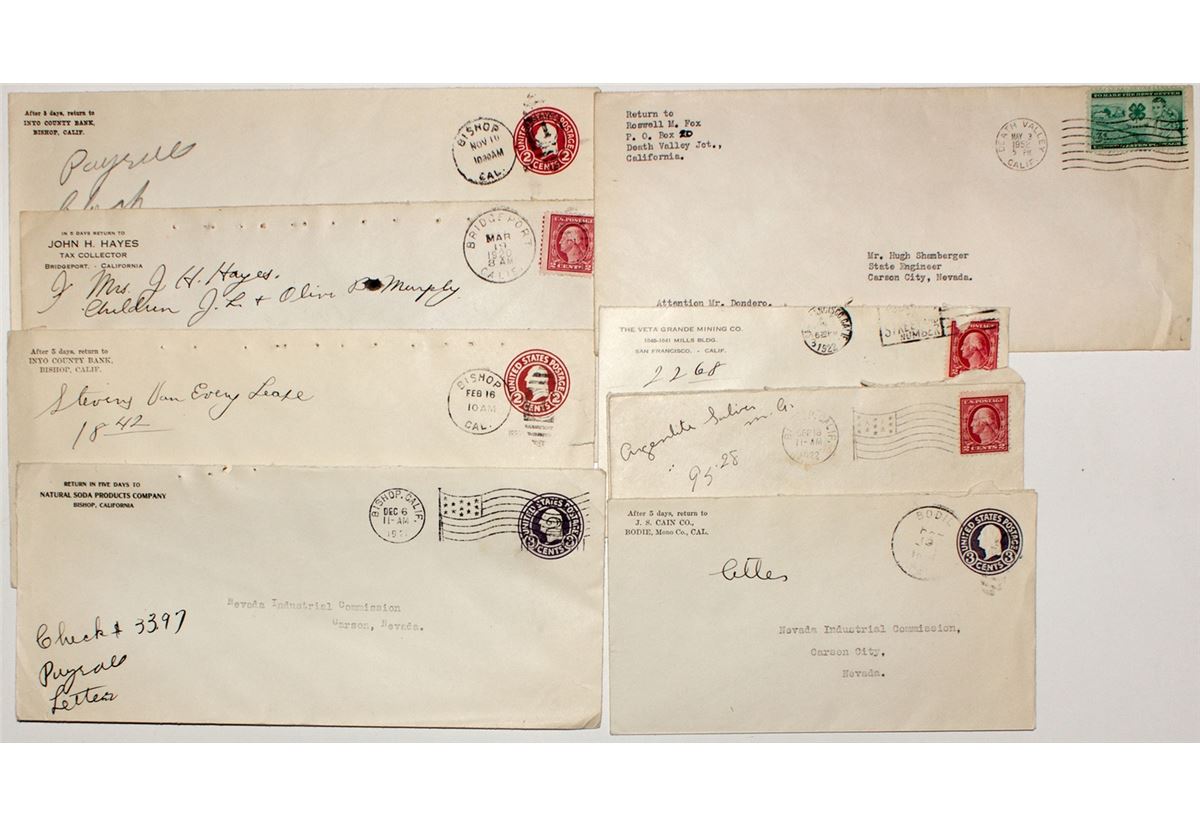 1) Bodie, J. S. Cain cancel. 2) Roswell M Fox 1952 Death Valley cancel. 3) John H. Hayes tax Collector Bridgeport cancel. 4) Natural Soda Products Bishop cancel. 5) Veta Grande Mining Company San Francisco cancel. 6) Two Inyo County Bank Bishop cancels. See photograph for condition.