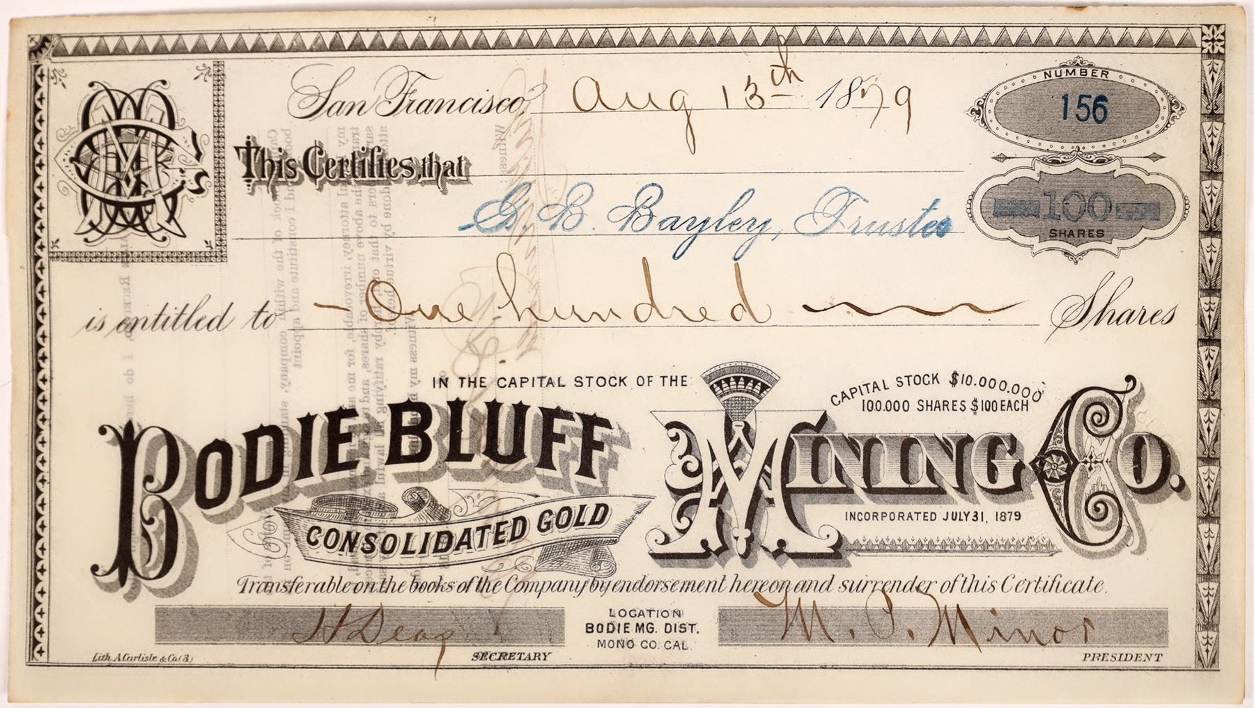# 169 for 100 shares to trustee Bayley in 1879. Issued to trustee Bayley. Signed by president Minor and secretary Deas. Not cancelled. Black border and print with fancy script. Printed by A. Carlisle & Co. Excellent condition. The original Bodie Bluff Consolidated Mining Company was formed with Leland Stanford in the 1860s and was the first mining company organized in the district.