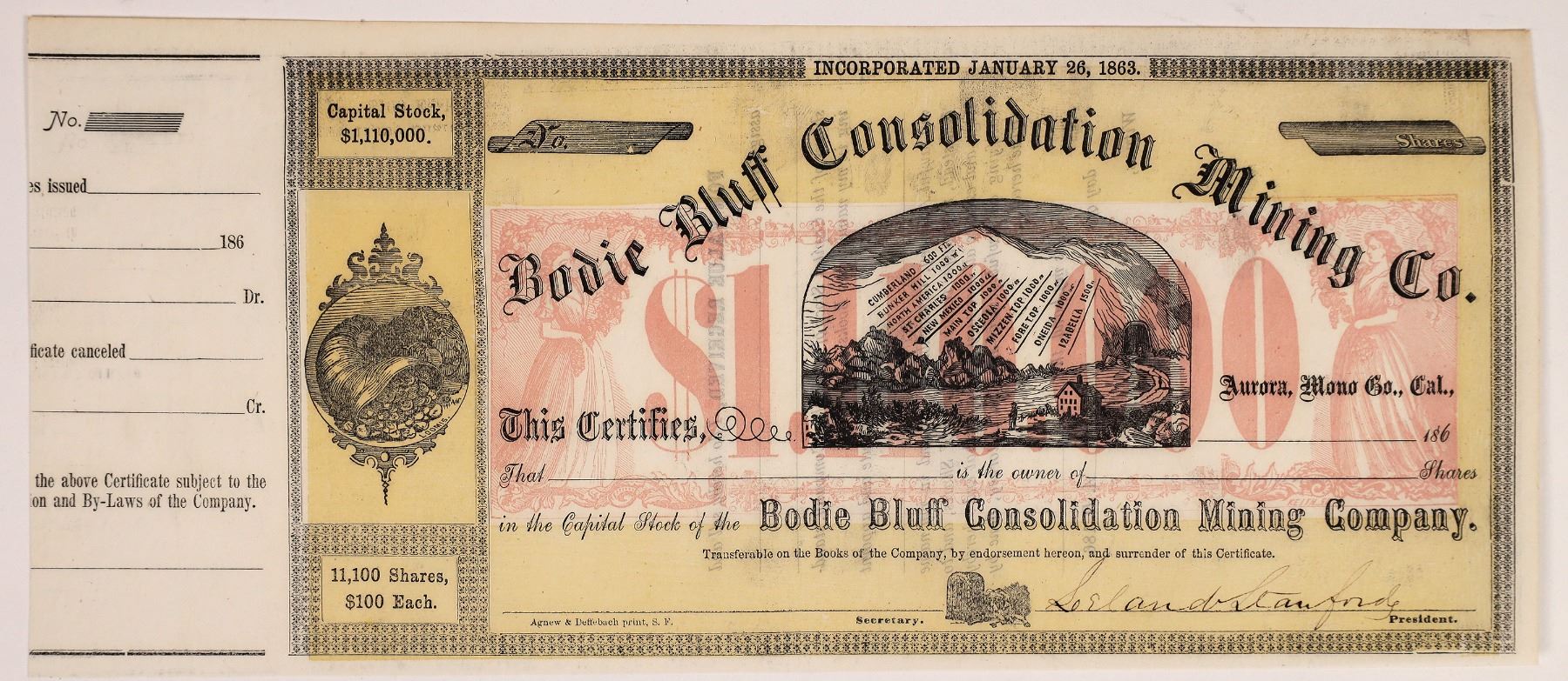 Incorporated in 1863. Unnumbered, unissued stock certificate but signed by Leland Stanford as president. Yellow ground with pink underprint: $11,100 and two women in long gowns holding branches. In center of pink area is vignette of a mountain with house in the foreground and a road running past the house into the tunnel entrance. Written on the side of the mountain are names of 11 mines and depth in feet of each, all of the lodes at Bodie under the company's umbrella: Cumberland, Bunker Hill, North America, St. Charles, New Mexico, Main Top, Osceola, Mizzen Top, Fore Top, Oneida, and Isabella (with a backwards 'S'). 5.5 x 12.5" including stub. Agnew & Deffebach printers. XF. Stanford was an important western financier, president of the CPRR, Gov. of California (1861-63), and US Senator (1885-93). This was the first consolidation of mines at Bodie, but failed for Stanford. The Bodie Bluff was the forerunner of the famous standard mine. Standard was located under the name of The Bunker Hill Mine, the original locators selling out their interests for twenty thousand dollars to an actor named James Stark and a jeweler named John W. Tucker. They soon ran out of money and were forced to sell their "Opera House Mill" as it was called. A geologist Professor J.D. Whitney gave a good report on the property, and new capital was brought in. A new consolidation of claims took place. Leland Stanford, then Governor of California, was elected President, and Judge F. T. Bechtel, Secretary. The new company was called "The Bodie Bluff Consolidated Mining Company", and was incorporated for over a million dollars. Governor Stanford brought a mining expert up with him to Bodie. The "expert", in looking over the property advised Stanford to get out, saying he himself would not give five hundred dollars for the whole district. (The fact was that there were millions just beneath the place where they were then standing). The Governor took his advice and decided to abandon this seemingly worthless mining ground. The so-called "expert" lived to regret the day he gave this advice. [Ref: Browne, others.]