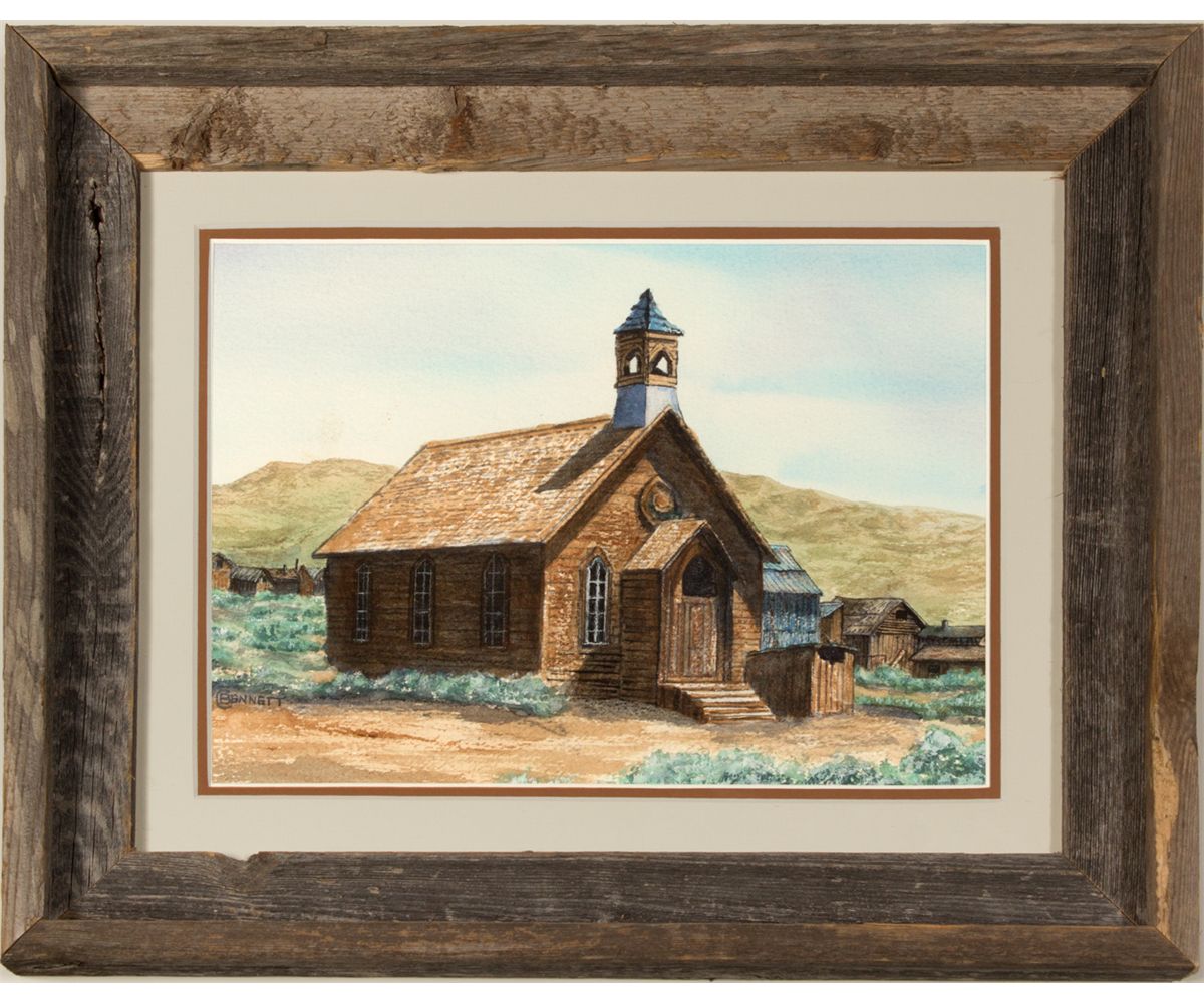 Watercolor landscape painting by Cheryln Bennett. (Framed: 13.5" H x 16.5" W). Painting depicts old church in Bodie, CA, a famed ghost town.