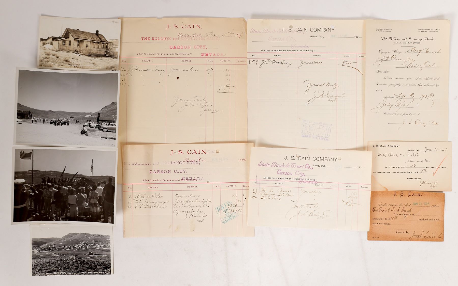 Bodie/Carson City ephemera collection (11), including bank receipts to J.S. Cain Company from The State Bank & Trust Company of Carson City (2), as well as receipts between the Bullion & Exchange Bank of Carson, also to the J.S. Cain Company. Photos included show a dedication ceremony in both 1964 and 2004. Please see photos for more details. Bodie California