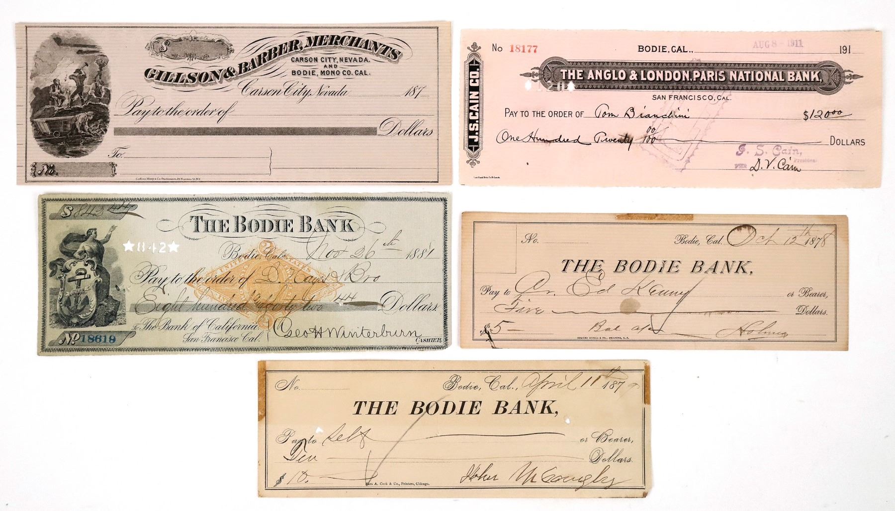 5 Bodie checks. 1881 Bodie Bank with RN, 1911 Anglo & London Paris National Bank, 1870's Gillson & Barber Merchants, 1878 The Bodie Bank with Holmes of Lundy, CA signature, and also 1879.