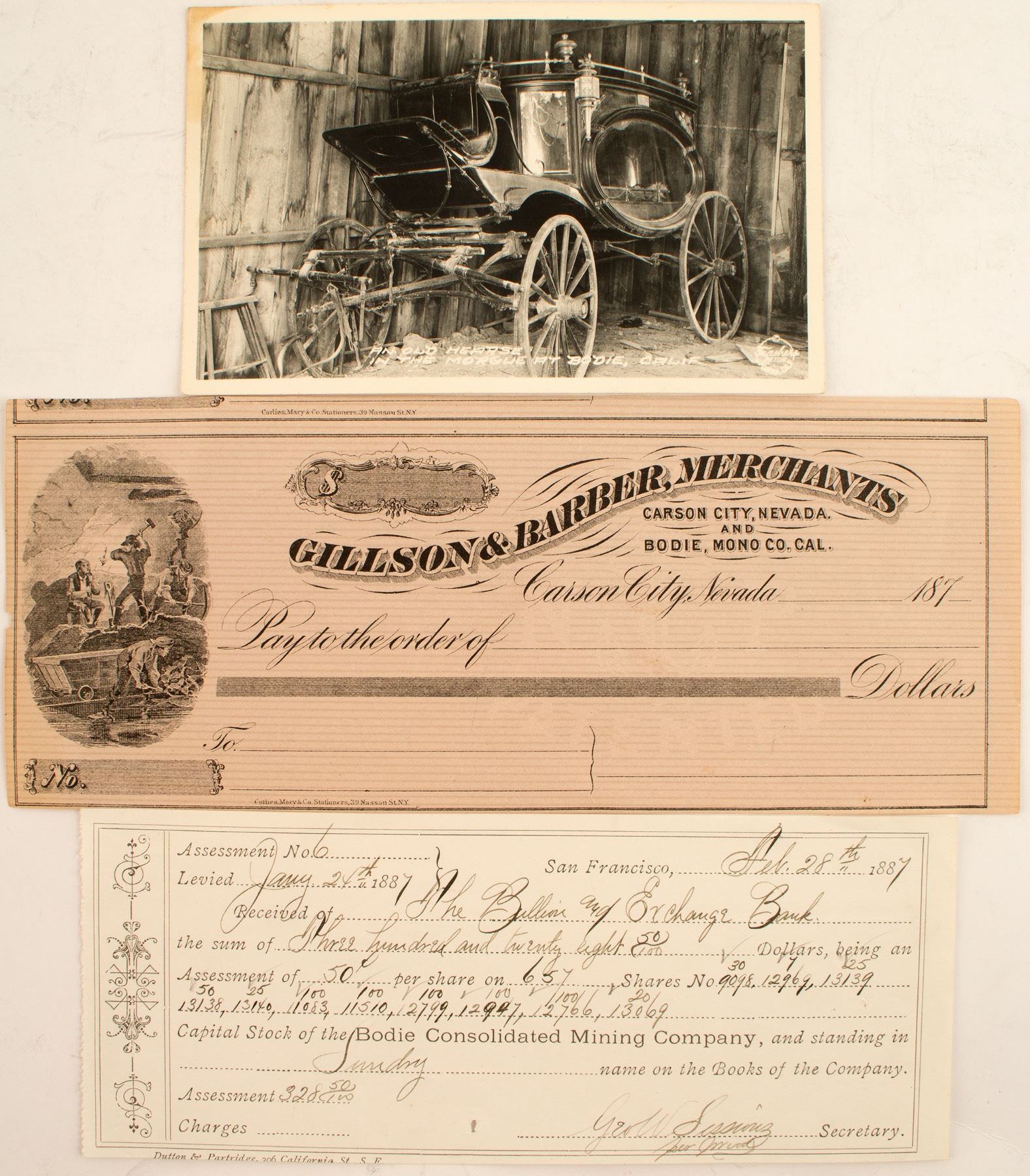 1) Formed in 1863, this was the district's first corporation. This receipt from The Bullion & Exchange Bank stating that Assessment No. 6 for $328.50 is enclosed for 657 shares. The receipt is printed by Dutton & Partridge, 206 California, S.F. Foldlines with several small tears and holes, otherwise very fine. 2) Unused 187- Gillson and Barber, Merchants check. Datelined Carson City with offices also in Bodie. Mining vignette. 3) Frasher RPC of the old Bodie hearst. State: California City: Bodie HWAC#: 49064 Date: 1889