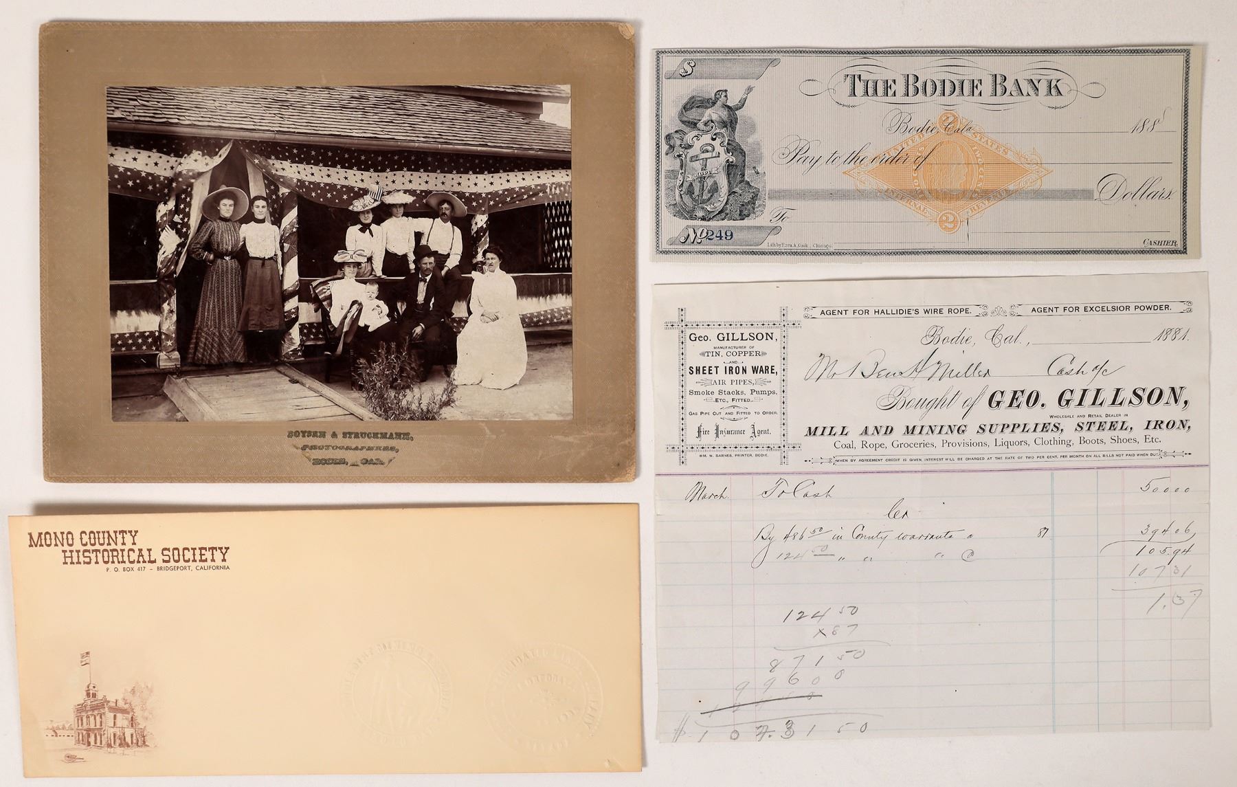 Nice group of Bodie ephemera. 1881 Geo Gillson mining billhead. 4th of July portrait by Boysen & Struckmann , 5x7" with nice contrast. Mono County Historical Society envelope with 2 Bodie Mining embossed stamps. Unused c. 1880's Bodie Bank check with RN.