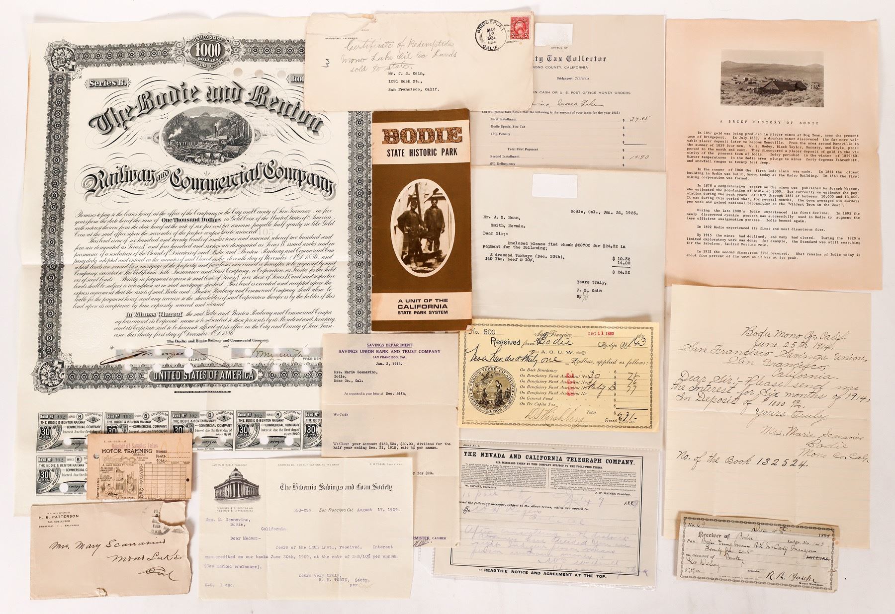 Bodie ephemera collection including a Mono County Tax Collector bill, handwritten letter from Bodie resident seeking the interest payment on her account from a San Francisco savings institution, a bill for 140 pounds of beef and two dressed turkeys for $24.32 and more. All in nice condition. Please see photos for more detail. Bodie California
