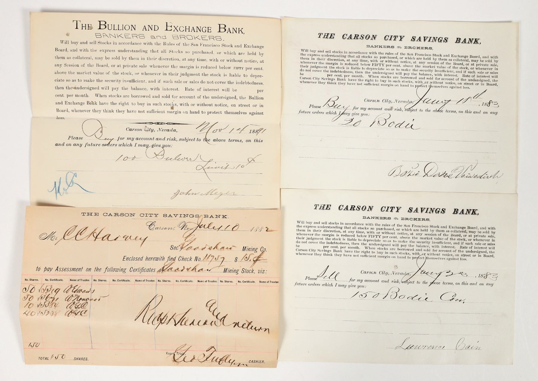 Lot of 4. Three are Bullion & Exchange Bank receipts for sales of Bodie mining stocks, 1883-91, for the Bodie, Bodie Consolidated, and Bulwer Mines. The 4th piece is a Carson City Savings Bank receipt, 1882, for payment on assessments for the Goodshaw Mining Company.