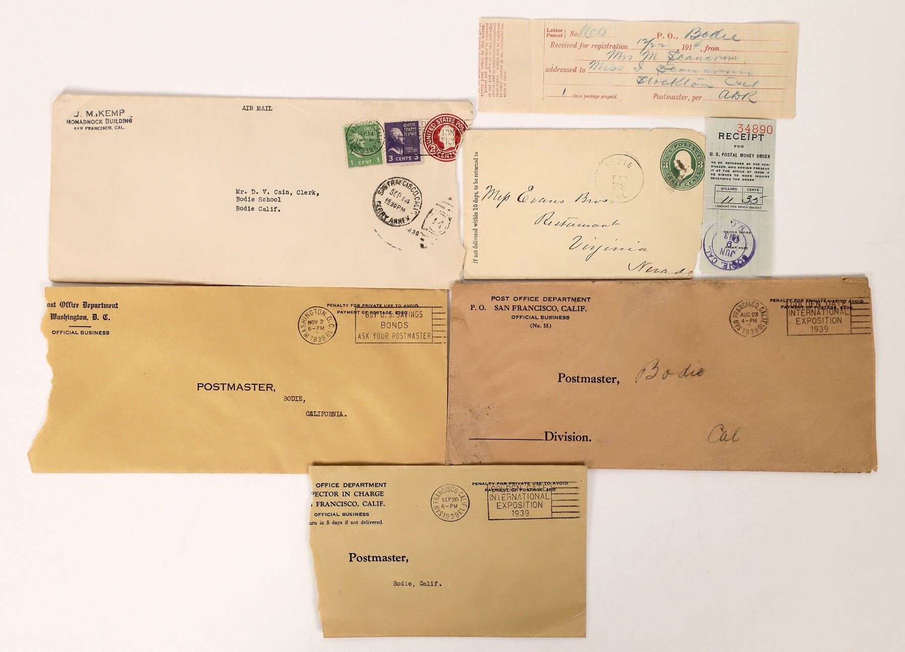 Bodie addressed or postmarked covers, including one from the Postmaster General, a postmarked cover to Virginia City, a registered letter receipt, a letter addressed to Bodie School and more. Please see photos for more details. California Bodie 1900s