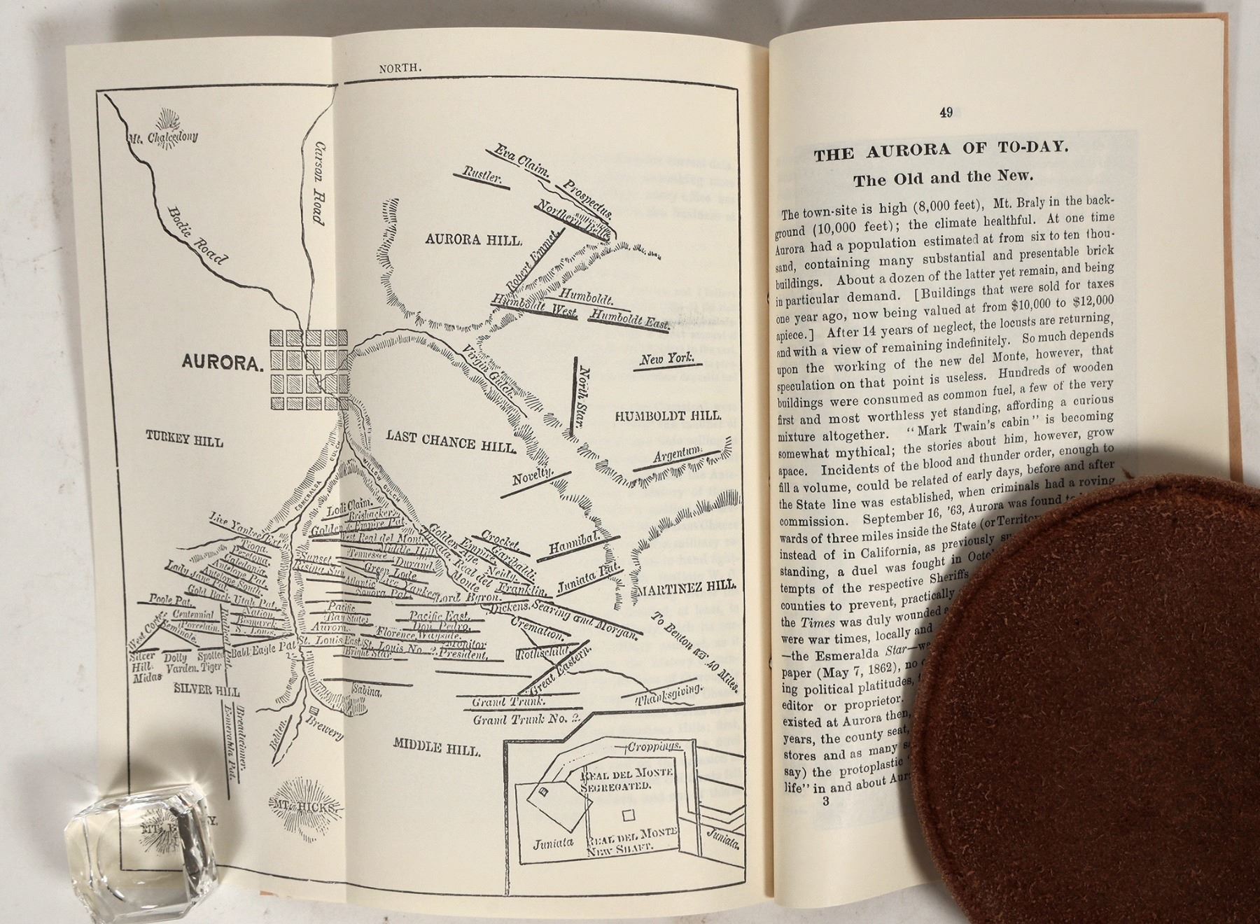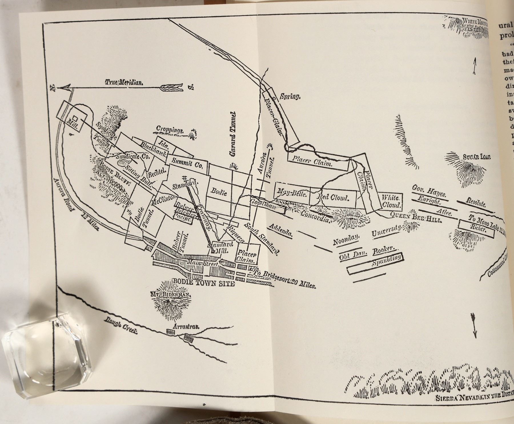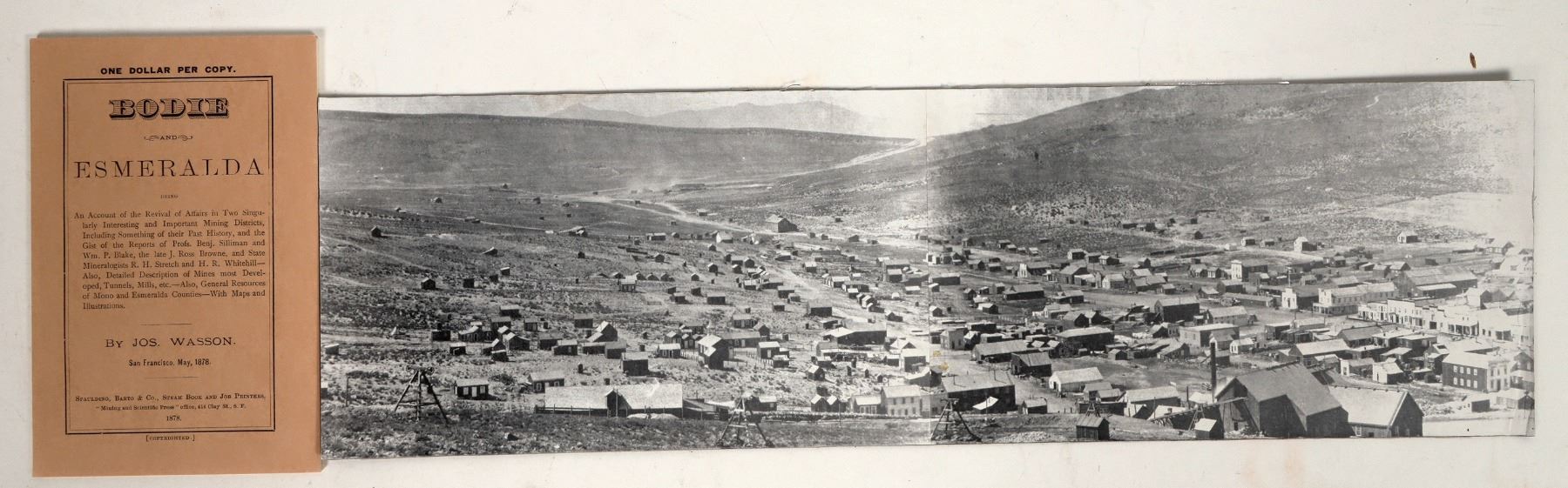 Lot of 2 items for this famous California mining camp, now a State Historic Park. 1) 6 x 19.5" mounted photo reprint. Panorama of Bodie in 1879, right at the boom. View is looking west. Photographer unknown. 2) Reprint of the 1878 Bodie & Esmeralda by Jos. Wasson. 60pp. with two maps. 7 x 4.5" Reprinted by Theron Fox, San Jose.