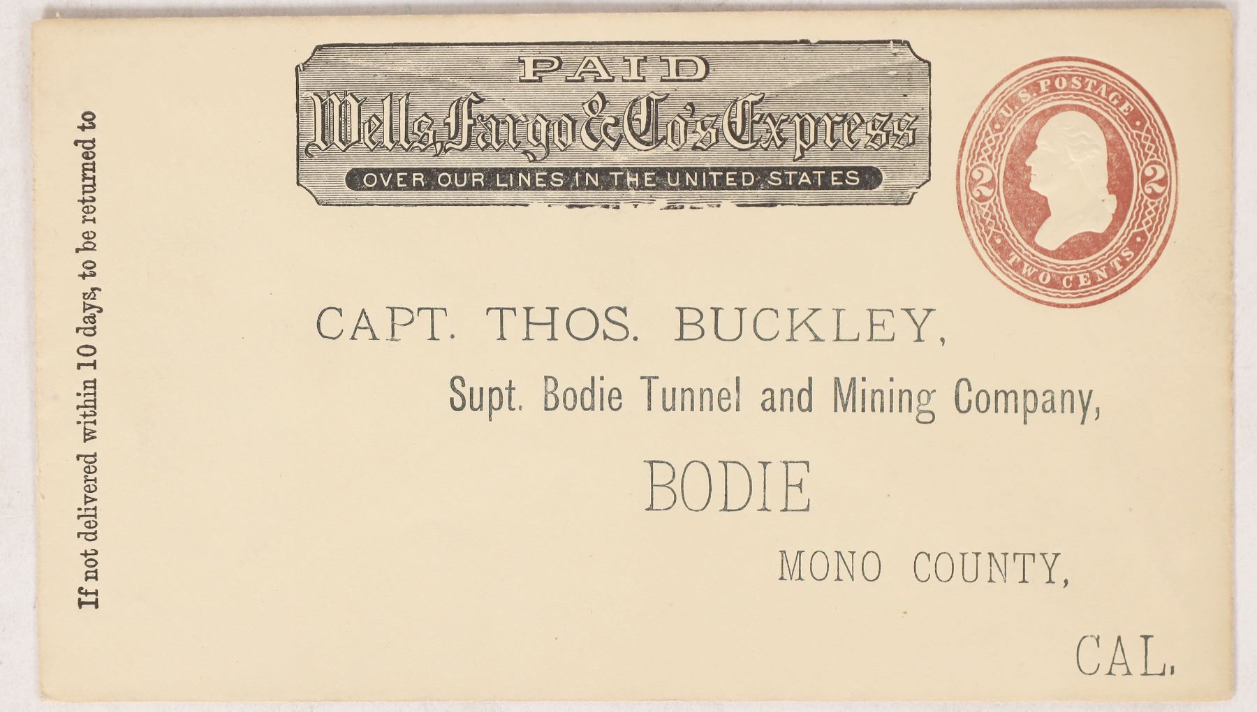 Cover addressed to Capt. Thomas Buckley, superintendent of the Bodie Tunnel and Mining Company. It also has a Wells Fargo & Company Express logo. Doesn't appear to have been cancelled. Please see photos for more details. Bodie California