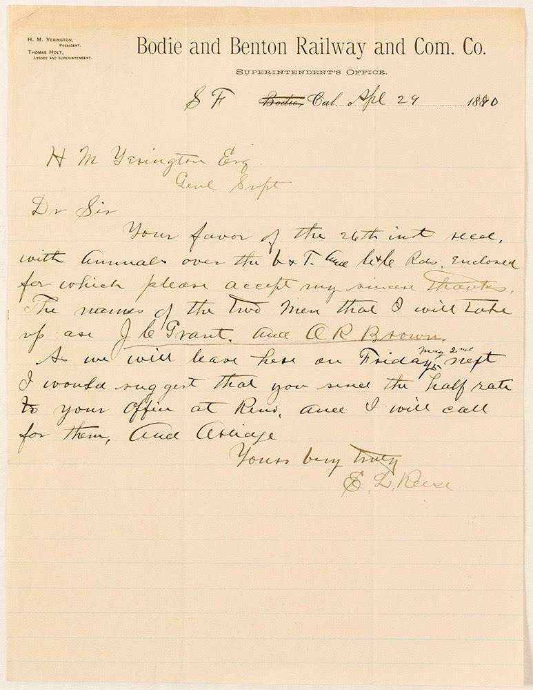 Bodie & Benton Railway & Commercial Co. Letter from Bodie & Bodie operator E. L. Reese on the letterhead of the B&B addressed to H. M. Yerington in Carson City, Apr 29, 1890. The letter discusses interaction with the Carson & Colorado RR and the V&T RR.