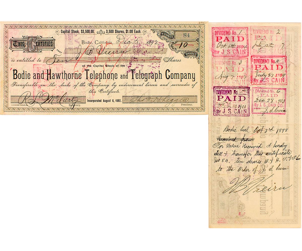 Inc. August 6, 1892. Dateline Bodie, California, Dec. 5, 1892. Certificate # 84, issued for ten shares to J.B. Vierra. Signed by Thos. H. Leggett as president and R.L. McCarty as secretary. Pen cancelled 1905 on front. Reverse has assessment stamps and handwritten message indicating that the shares have been transferred to prominent Bodie banker and businessman J.S. Cain. Printed by H.S. Crocker Print, S.F. Pinholes, folds, and some smudging of stamp ink. (Prag Collection)