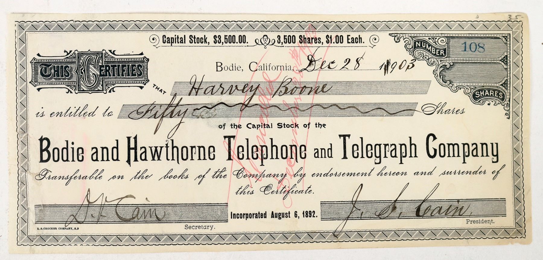 Issued 1903 Bodie and Hawthorne Telephone and Telegraph stock signed by banker and famous Bodie resident, J S Cain.