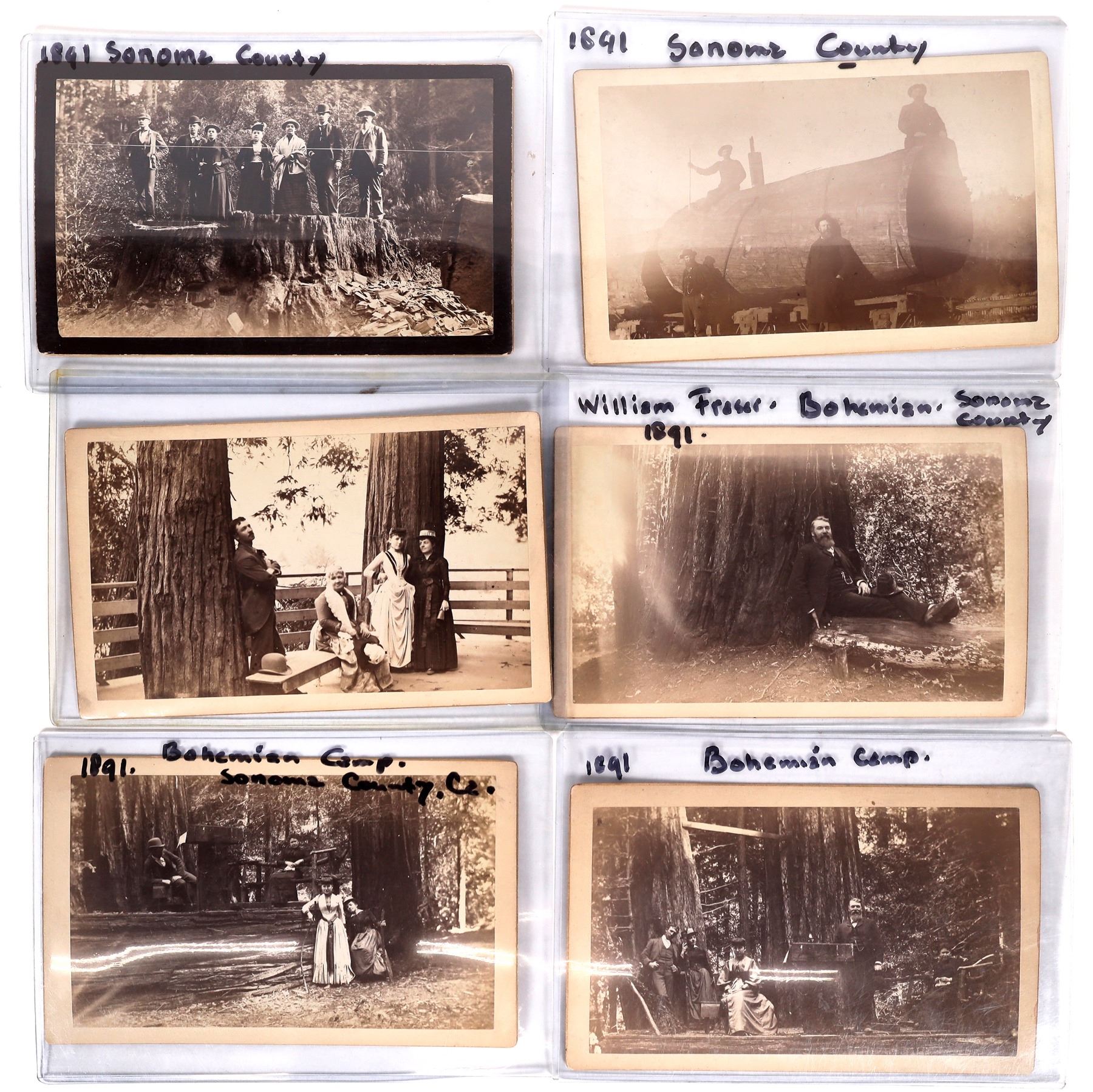 Nice set of 6 4.5x7.5" photos. Bohemian Camp-1891 with 3 women and 1 man on a log. 1891 3 women and 2 men near a podium. William Fraser in front of a redwood. Sonoma-1891 4 men near a log. 3 women and 1 man near a bench. 1891 7 people on a large redwood stump."The tradition of a summer encampment was established six years after the Bohemian Club was formed in 1872. Henry "Harry" Edwards, a stage actor and founding member, announced that he was relocating to New York City to further his career. On June 29, 1878, somewhat fewer than 100 Bohemians gathered in the Redwoods in Marin County near Taylorville (present-day Samuel P. Taylor State Park) for an evening sendoff party in Edwards' honor. Freely flowing liquor and some Japanese lanterns put a glow on the festivities, and club members retired at a late hour to the modest comfort of blankets laid on the dense mat of Redwood needles. This festive gathering was repeated the next year without Edwards, and became the club's yearly encampment. By 1882 the members of the Club camped together at various locations in both Marin and Sonoma County, including the present-day Muir Woods and a redwood grove that once stood near Duncans Mills, several miles down the Russian River from the current location. From 1893 Bohemians rented the current location, and in 1899 purchased it from Melvin Cyrus Meeker who had developed a successful logging operation in the area. Gradually over the next decades, members of the Club purchased land surrounding the original location to the perimeter of the basin in which it resides." from wikipedia