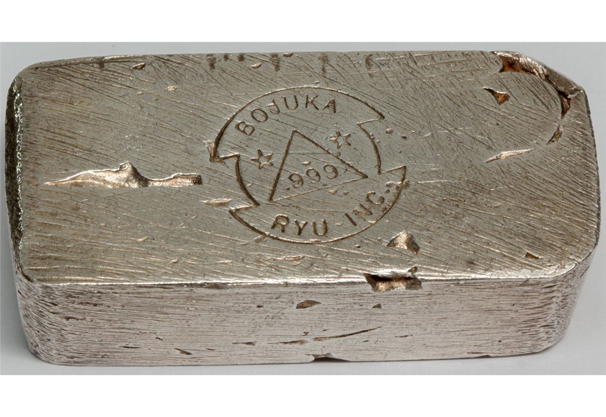 This is the only Bojuka Ryu Inc. ingot in this sale that has the hand stamp of the company. The hand stamp is located on the reverse. 5 troy oz, .999+ fine. According to the consignor, Bojuka Ryu was founded in the 1970 in Marina, CA. It was located close to local karate club and later changed its name Bojuka Ryu in 1974. The name is a combination of the disciplines that were taught at the club.City: MarinaCounty: Monterey CountyState: CADate: 1970