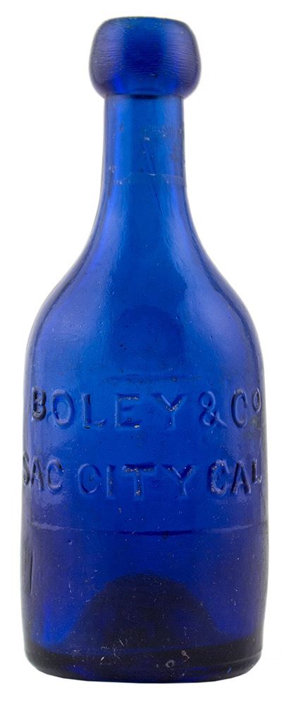 Union Glassworks Philadelphia. Boley & Co., Sac (ramento) City, Cal., Iron Pontil. Deep cobalt blue. There are several different embossed variants of the popular Boley bottle. Boley Soda Works was in business from 1850-1862. They were located in what we know today as "Old Town Sacramento". This example is as nice as you will find, with little or no wear to the letters. It also appears to never have been buffed. City: Sacramento State: California Inventory Number: 30406