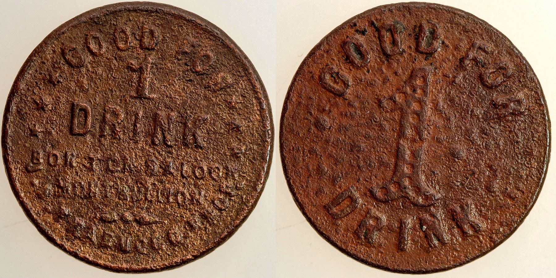 Round copper .75" GF/1 Drink/Bon Ton Saloon/Mont Bullion/J B Trabuoco Prop//GF/1/Drink. Mt. Bullion British Columbia