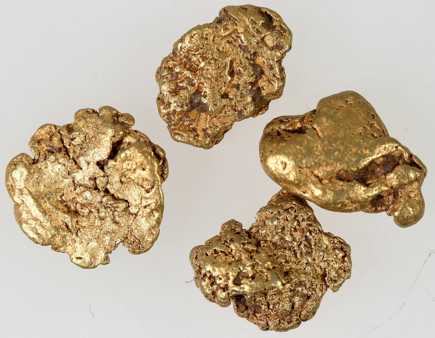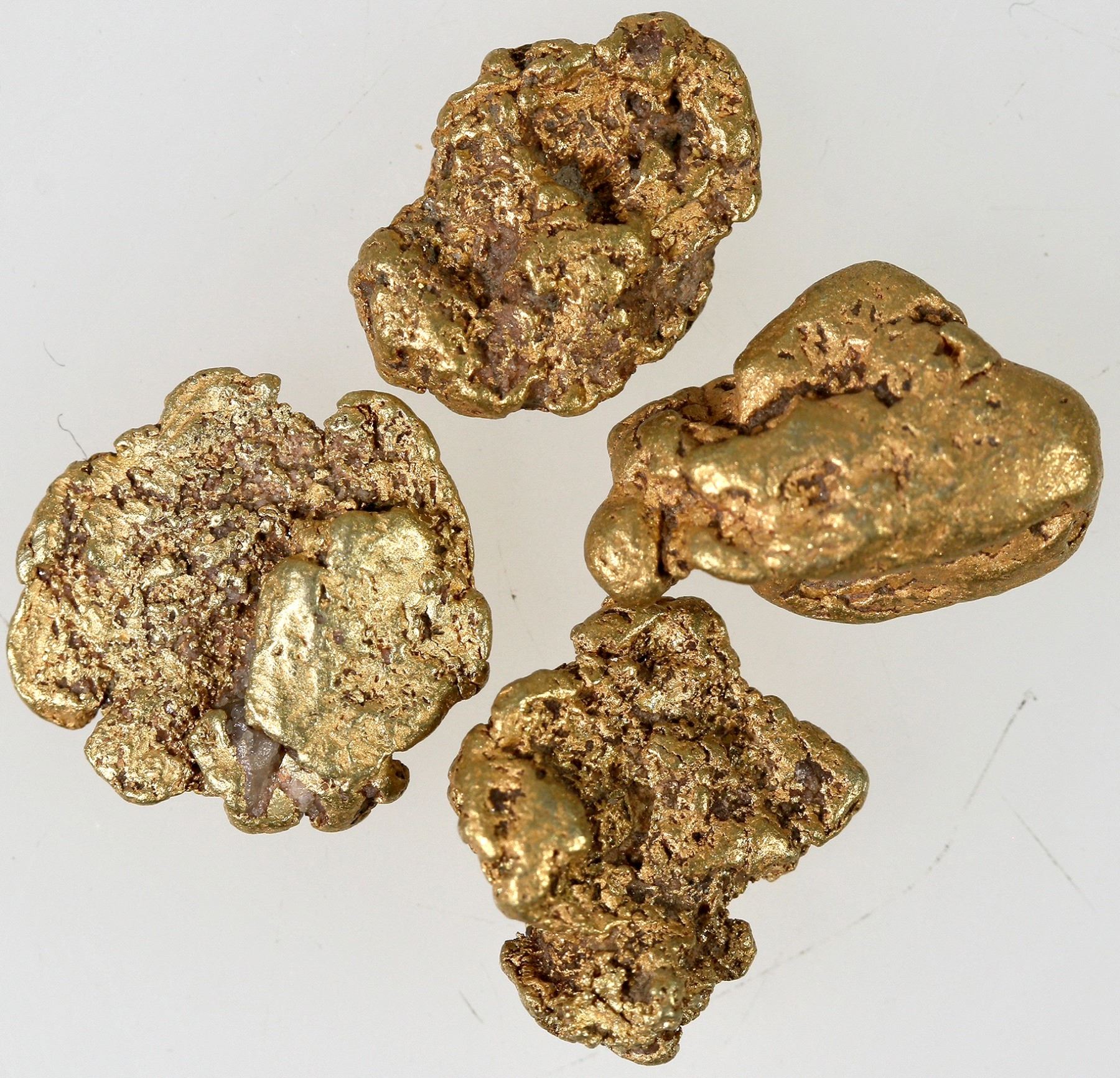 Four gold nuggets from the Bonanza Creek, District, Yukon Territory. Total weight of 5.5 grams; each nugget is about 10 mm. The huge Bonanza Creek district contains the famous Yukon gold camp of Dawson. The region produced well over 1 million ouncers of gold, and continues to produce gold every year.