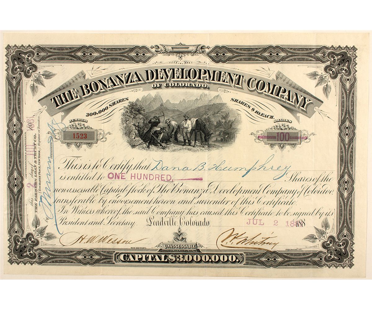 Cert. #1523, issued to Dana B. Humphrey for 100 shares. Signed by President J.P. Whitney and Secretary H.W. Wesson. Black border, central vignette. U/C. Datelined Leadville. Printer: ABN Co., N.Y. In the years of 1880-1900, the ores of the Leadville area were considered Bonanza grade. Rich ore bodies at the contact of the Leadville Limestone allowed for nearly 1 million ounces of silver to be produced in 1880. Most likely this company adopted the Bonanza name from the rich ores they hoped to exploit. Rare. Very fine.City: LeadvilleCounty: LakeState: CODate: