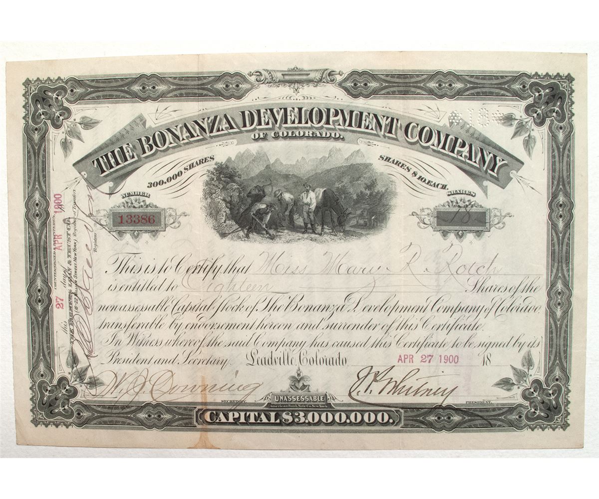 Incorporated in Colorado. Cert. #13386, issued to Mary R. Roth in 1900 for 18 shares. Signed by President J.P. Whitney, an investor in many mining companies, and Secretary W. J. Downing. Black border, central vignette. U/C. Datelined Leadville. Printer: ABN Co., N.Y. Whitney took an exhibit of Colorado ores to the Paris Exhibition in 1867 in order to promote investments. In the years of 1880-1900, the ores of the Leadville area were considered Bonanza grade. Rich ore bodies at the contact of the Leadville Limestone allowed for nearly 1 million ounces of silver to be produced in 1880. Most likely this company adopted the Bonanza name from the rich ores they hoped to exploit. Rare. Very fine.