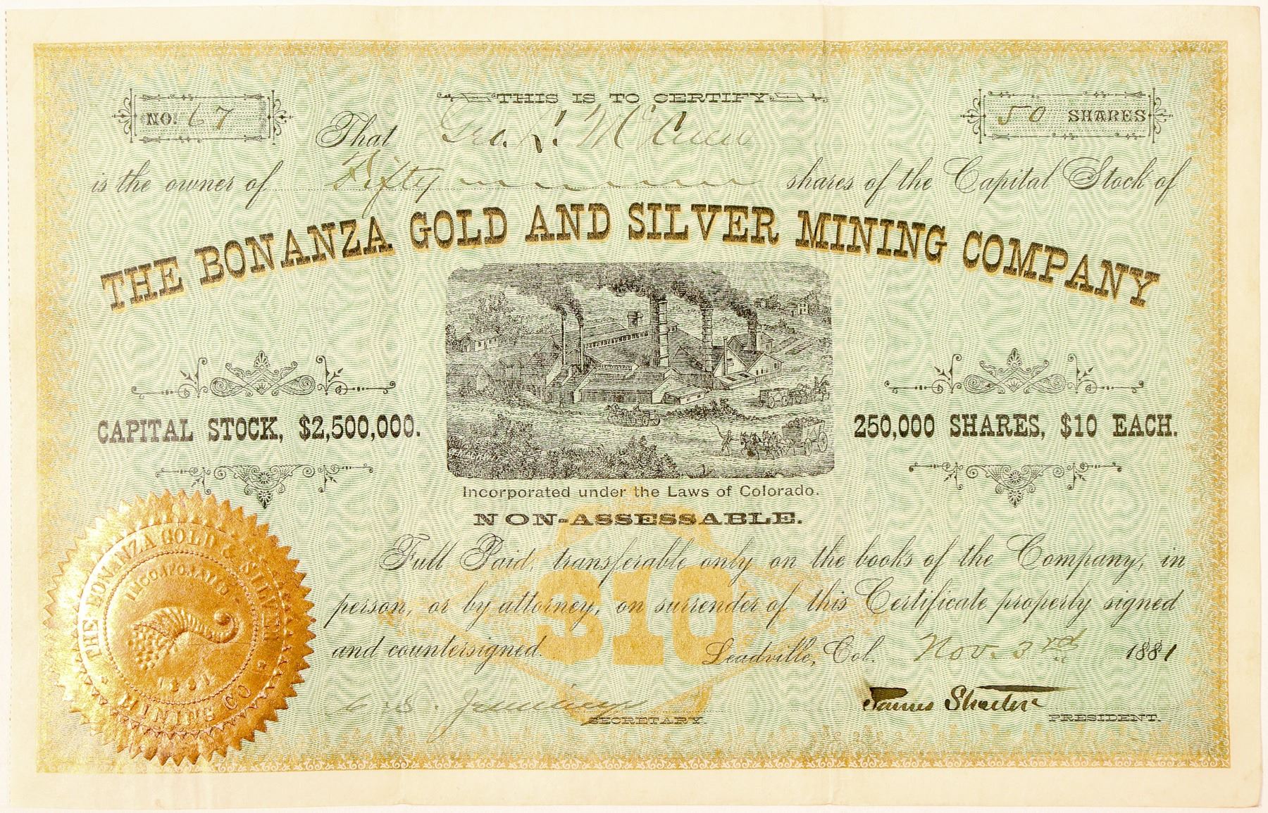 Inc. in Colorado. No. 67, issued for 50 shares in Leadville on Nov. 3rd, 1881. Signed by the the president (James Streeter) and secretary (C.S. Jennings). Gilt border, gold seal, green background with RN facsimile. Vignette of mine. Folds, one creased corner. 7 x 10.25" Not listed in the 1883 Colorado Mining Directory. Not in Filer. () Ken Prag Collection
