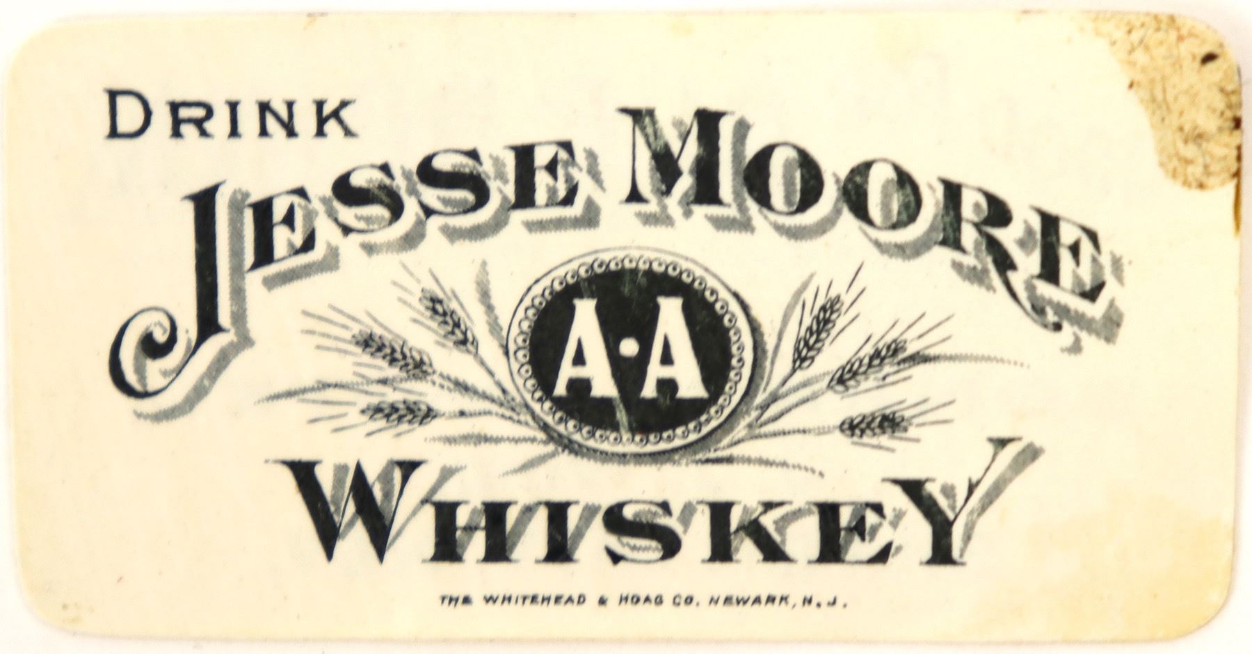 DRINK / JESSE MOORE / AA / WHISKEY / THE WHITEHEAD & HOAG CO. NEWARK, N.J. Celluloid, 48 x 24mm. Winn operated a saloon with Stenzer Stock in Silver City in 1893. Winn left the business and area just after 1900. City:Silver City State:Nevada Date:c.1899
