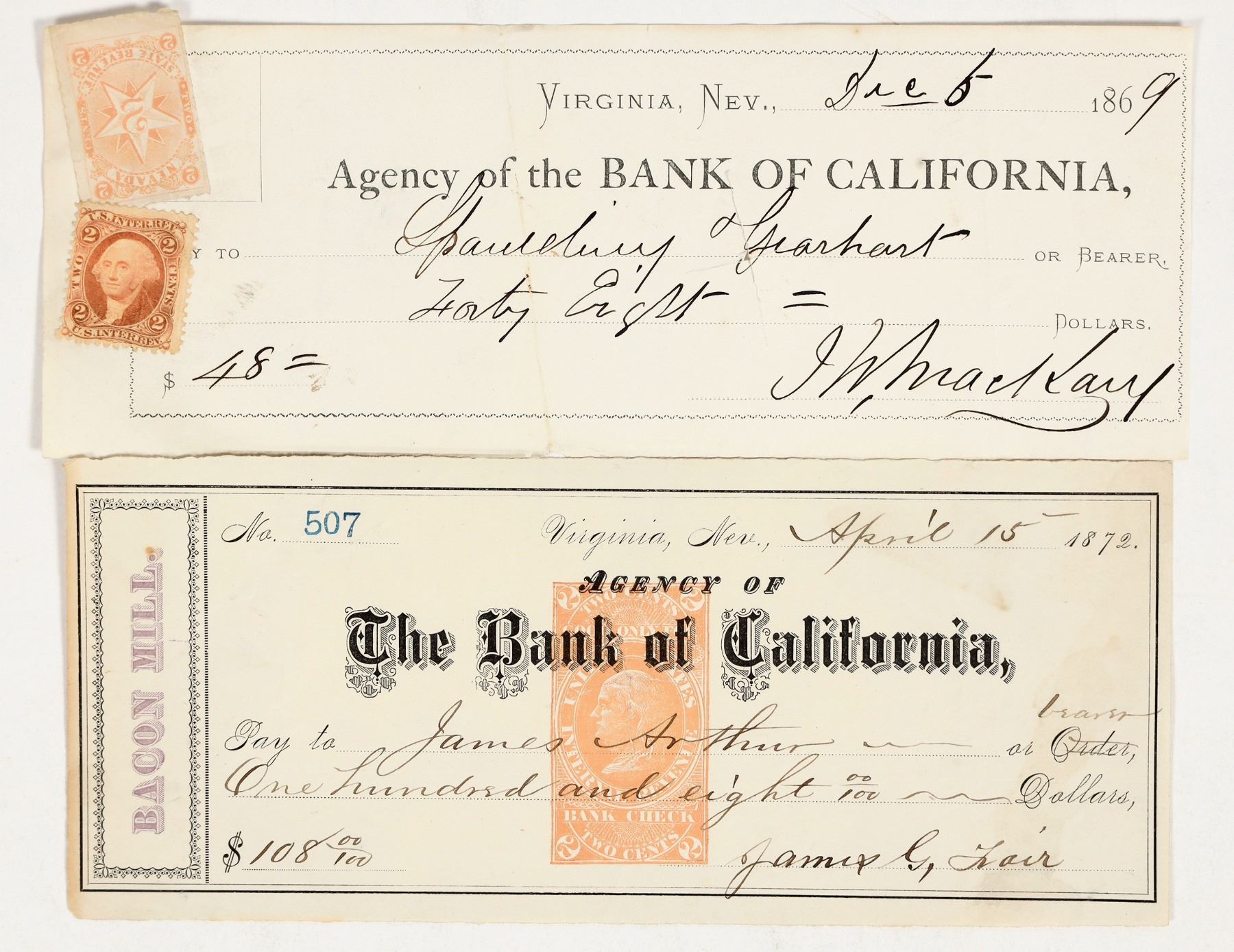 Lot of 2 different. Mackay and Fair were half of the "Bonanza King" Firm along with Flood and O'Brien, who worked mostly out of San Francisco. 1) 1869 Bank of California check issued to Spaulding & Gearhart (livery) for $48. Signed by mining millionaire superintendent John W. Mackay. Orange NV and US IR stamps attached. 2) Bacon Mill check issued in 1872 to James Arthur (listed as a miner for the Crown Point in the 1873 V&T directory). Signed by James G. Fair, who went on to become a US Senator for Nevada. RN-E imprinted revenue.