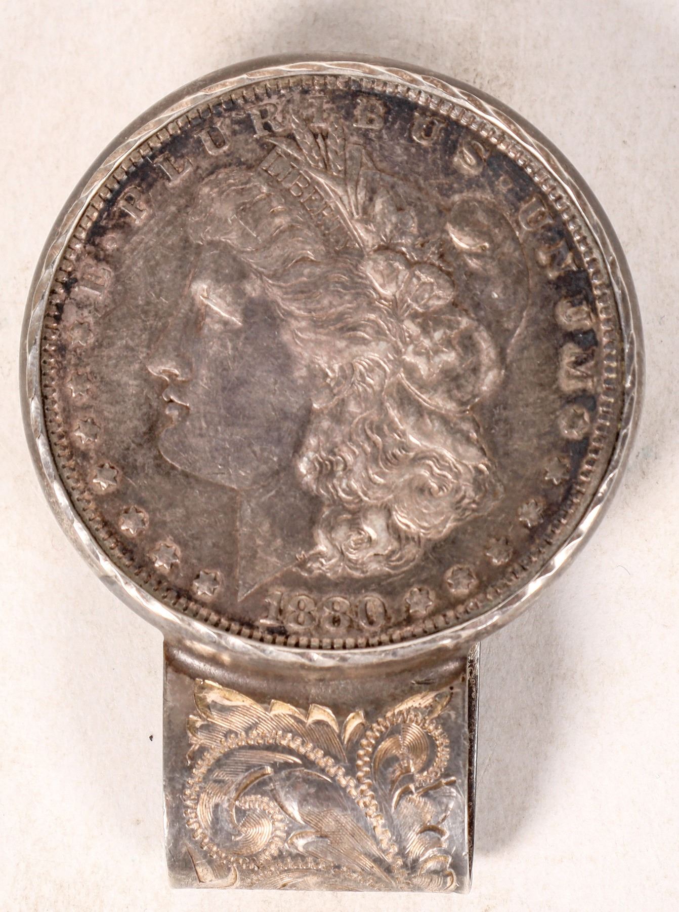 Sterling silver dollar money clip (1880-O) engraved "Bonanza Land & Cattle / Virginia City, Nev." Purported to be owned by Pick Hobson, owner of the Riverside Hotel/Casino from 1976-1986. Nevada
