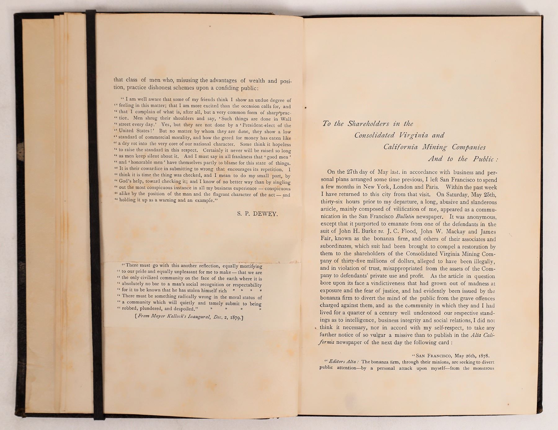 Second edition. A biased account of the stock market manipulations and other financial machinations of the owners and principal shareholders of the Consolidated Virginia and California Mining Companies. Presentation copy from the author to "Reverend W. A. Scott (of the Calvary Presbyterian Church in San Francisco) from the Author's Complements. Reverend Scott organized an expedition in late 1855 to Yosemite after Hutching's famed trip earlier that year. An outspoken critic, he was hanged in effigy when he spoke out against Vigilantism after the Committee of Vigilance of 1856 hung S. F. Supervisor Casey for the assignation of James King of William. Graff 1074. Cowan p. 168. The reader gets behind the scenes in the businesses of the celebrated Consolidated Virginia and California Bonanzas. This vicious attack was prepared by Alfred Wheeler at the instigation of S. P. Dewey, whose silence, it is alleged, the "Bonanza Kings" refused to purchase. Paher Nevada 476: "A rare book which was expanded in its second edition, 1880. These 'kings' reigned for five years, making fortune in Nevada mining." Howes D302. Streeter Sate 3459 (first edition): "Dewey is perhaps chargeable with bias, for he sold a dividend on the mines short and then the 'bonanza' crowd Flood, Mackay and Fair had the regular dividend paid, much of Dewey's wrath and loss. At any rate, this is one side of the story of the famous Consolidated Virginia Mine which made millionaires out of Mackay, Fair, et al."